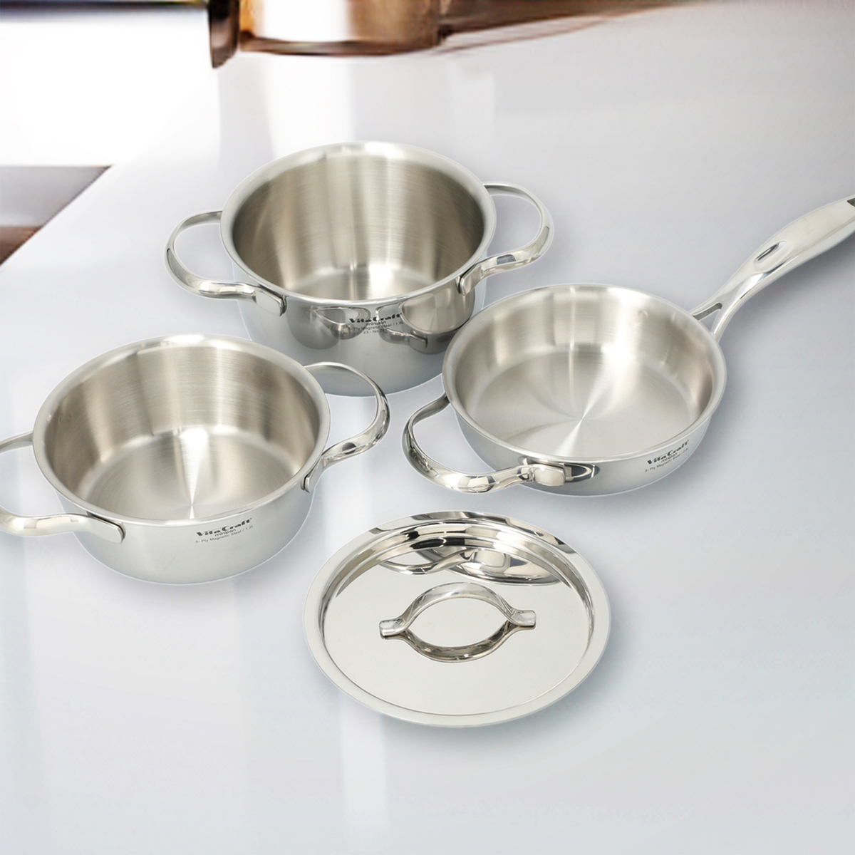 様々な調理ができる、ビタクラフトのミニパンコンボ。熱伝導の高い3層のアルミニウムを、保温性に優れたステンレスでサンドした全面5層構造(蓋を除く)のお鍋です。両手鍋大小2つと、浅型片手鍋、蓋をセットにしました