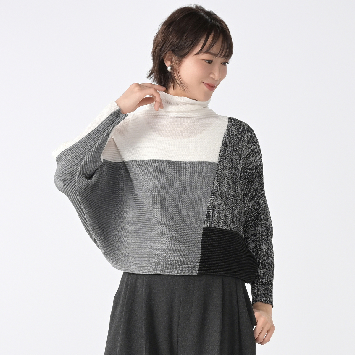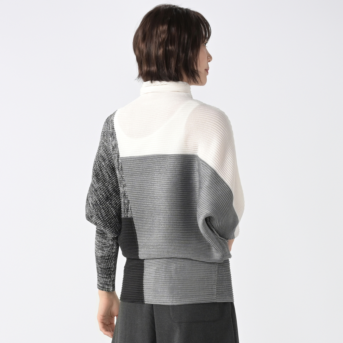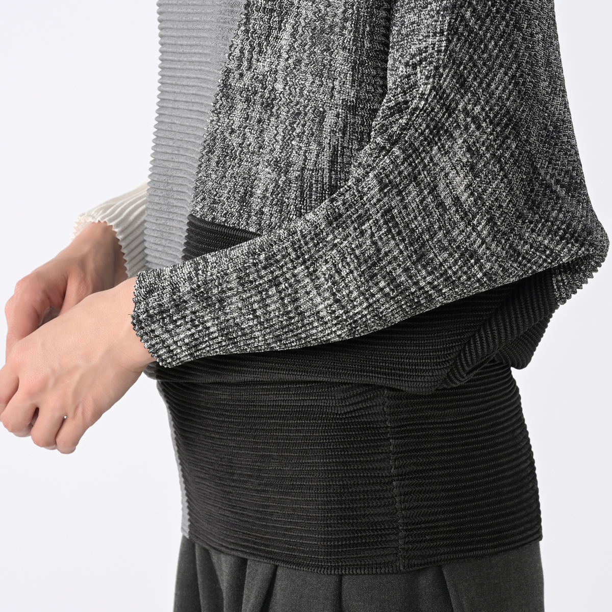 シャトルプリーツを使った、ドルマンチュニックです。裾部分を腰の位置で止めれば、ブラウジングトップススタイルに。裾を膝上まで伸ばせばワンピーススタイルにと、着ながらにしてレングスチェンジが可能。お手持ちのパンツと合わせれば、太もも部分を隠した着こなしになります
