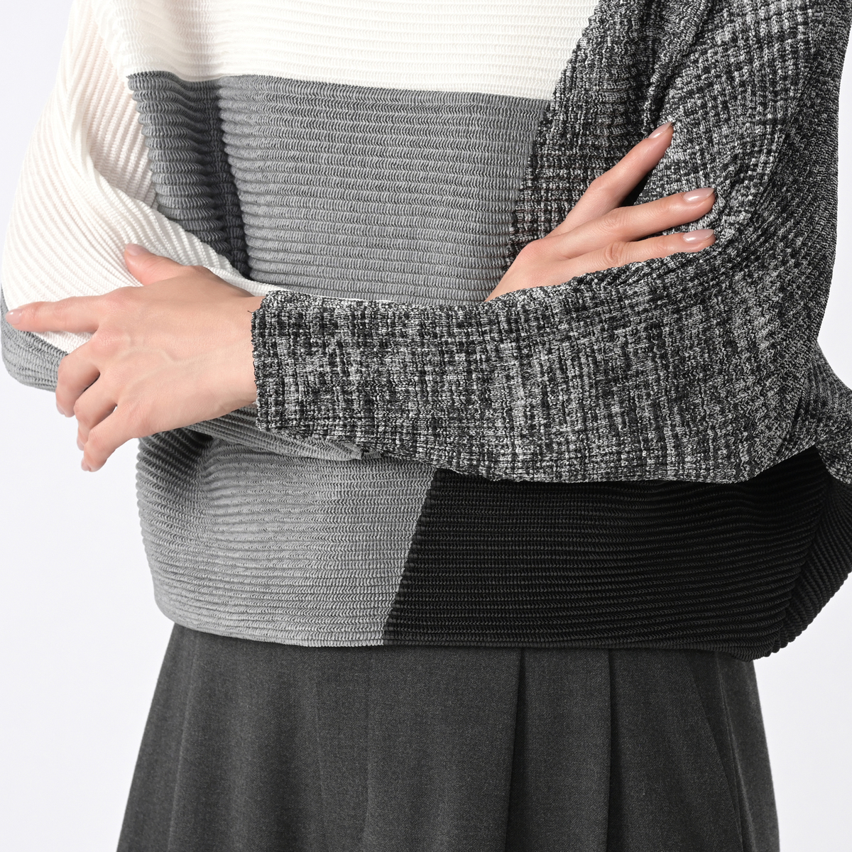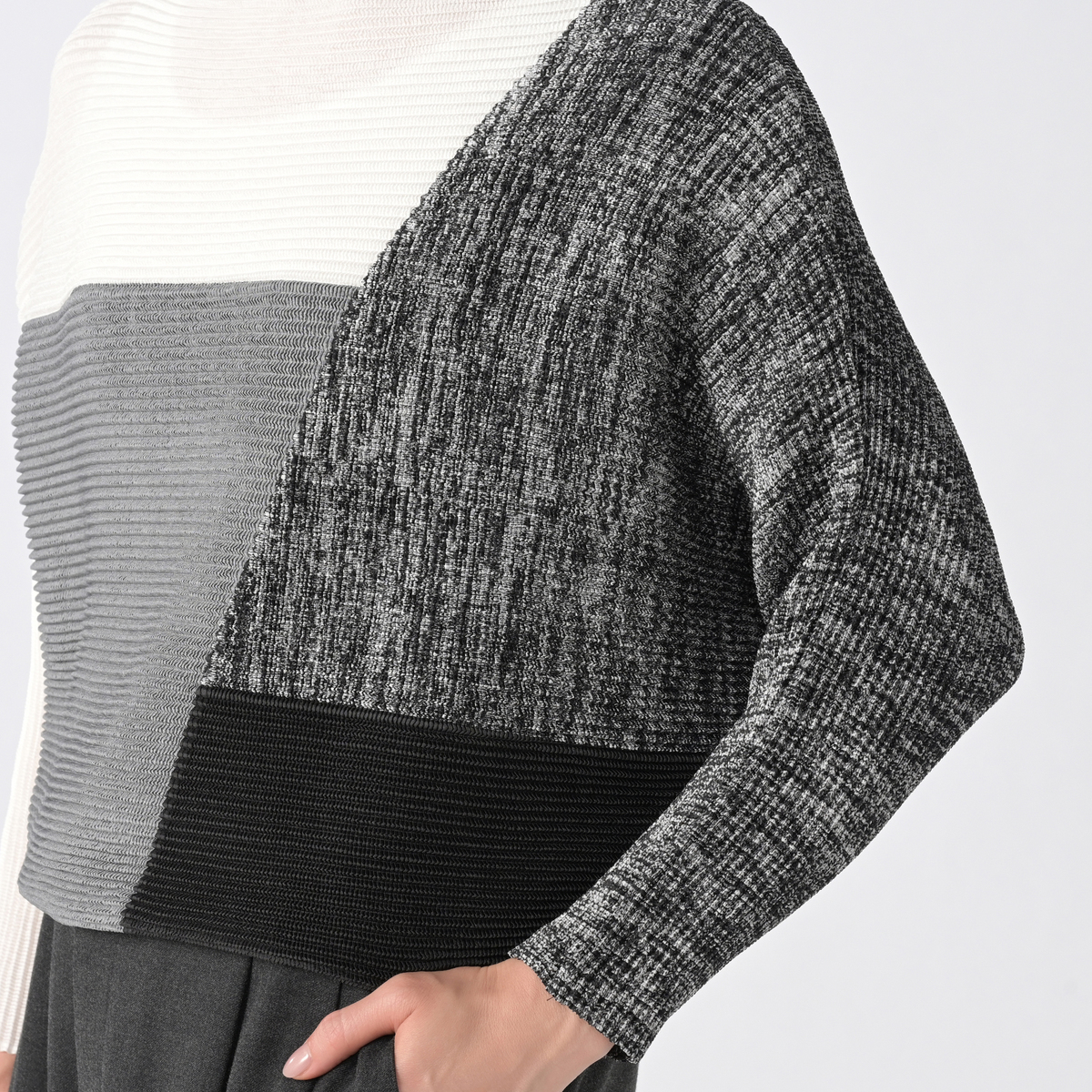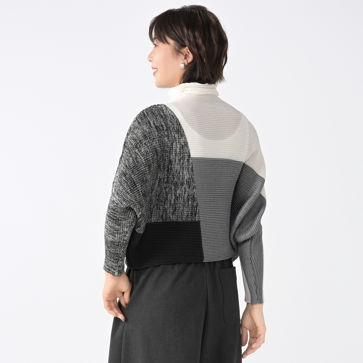 ドロップショルダーで肩は華奢見えし、腕は切り替え部分からすっきりと細見えになる仕様です。身頃はドルマン仕様なので、体型をカバーしながら厚地のインナーも着用可能。袖と裾が程よくフィットしているので、スタイルアップして見えるシルエットが自然と作れます