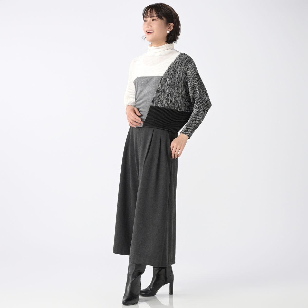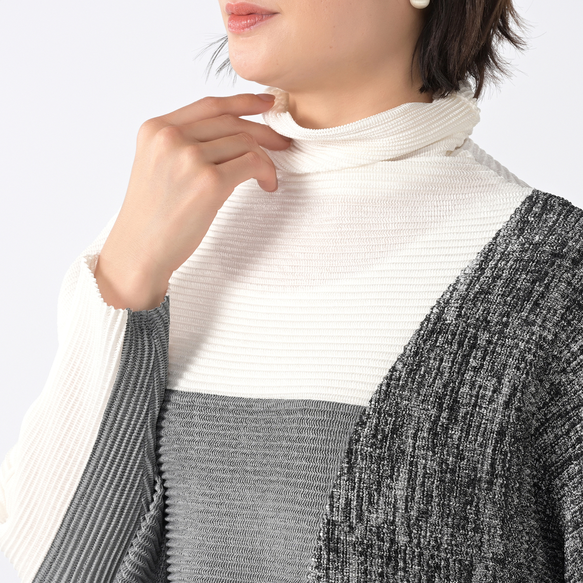 緩めのハイネックは、首元をほどよく包んであたたかく、衿のあるインナーを着用してもきつくなりにくいつくり。折り目に合わせて内側に折れば、すっきりとした印象に。お好みで、折らずにそのままクシュクシュさせて着ることもできます