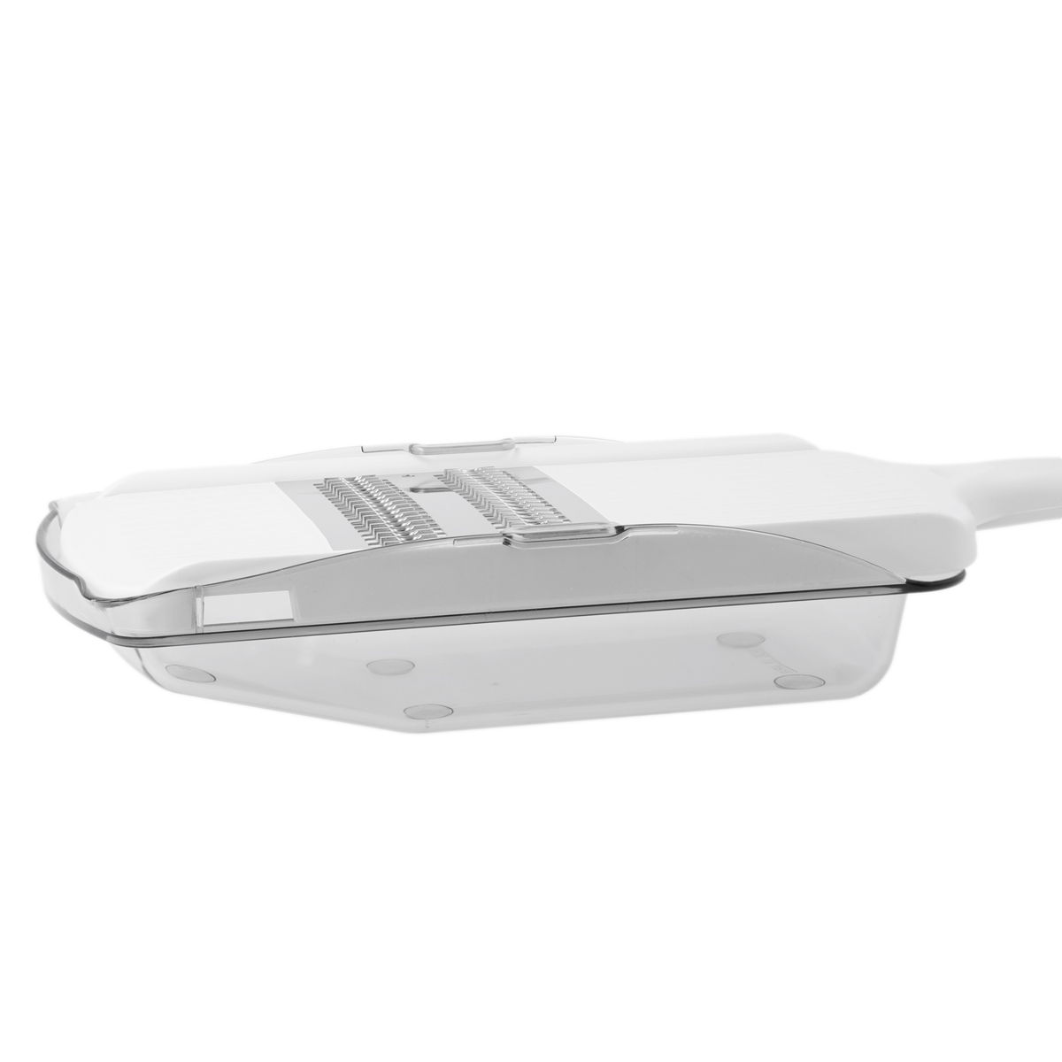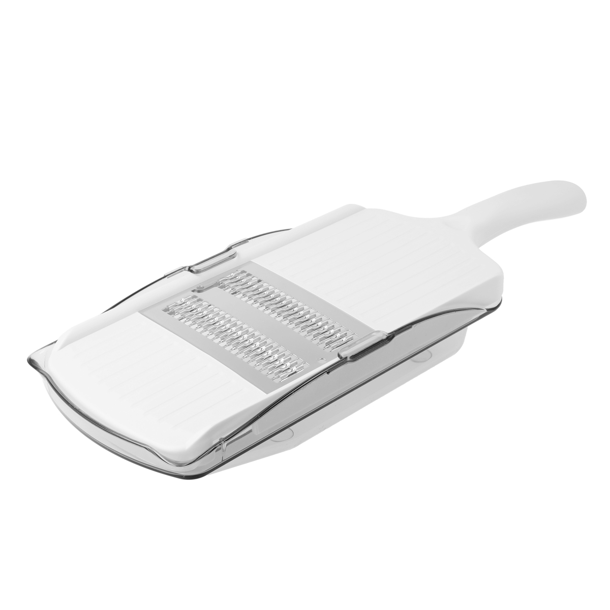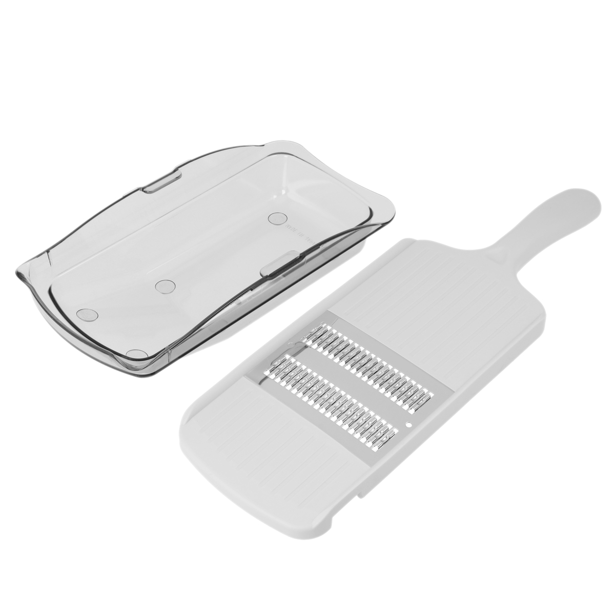 軽い力できれいな細千切りができるブレードです。独自のハンドル形状で持ちやすく、往復刃でスピード調理が可能。大根などの野菜の細千切りに便利な約1mm幅で、受け皿も付いています