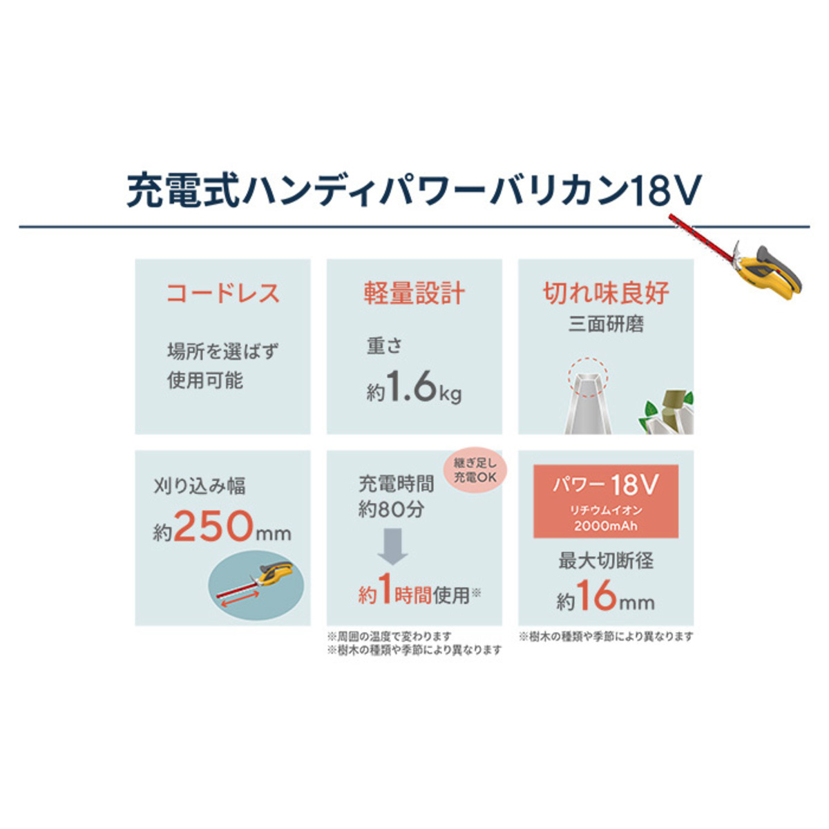 コードレスで場所を選ばず使用できる、ハンディパワーバリカン。約80分(*1)のフル充電で約60分(無負荷時)使用可能です。重さはバッテリーを含め約1.6kgで女性1人でも操作しやすく、切れ味の良い三面研磨の刃でラクにお庭の草木をお手入れできます