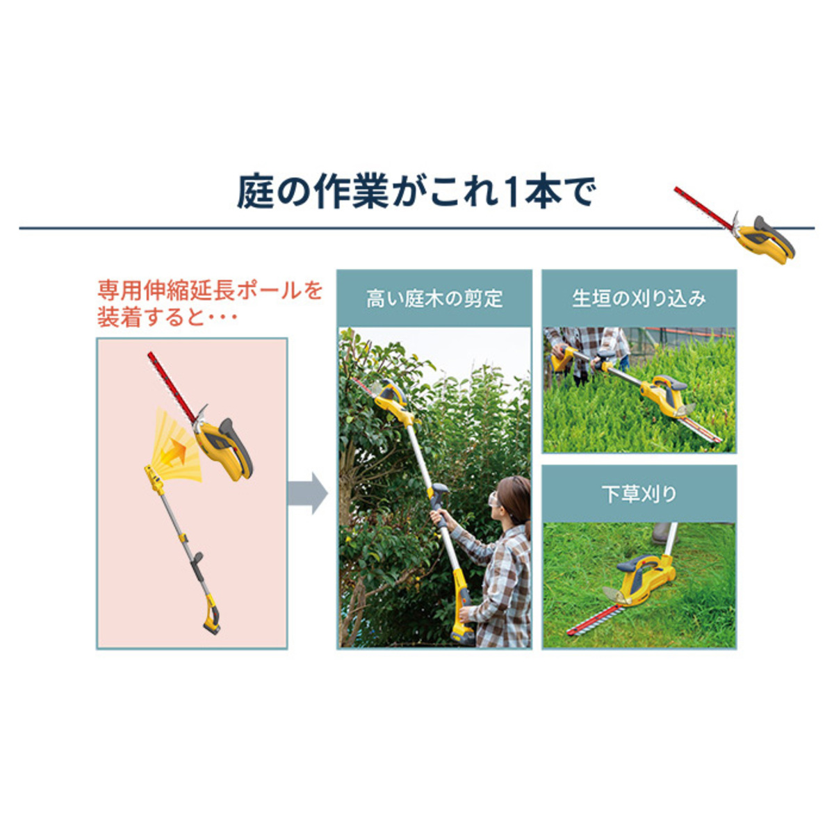 TSVで本体と延長ポール、替え刃、替えのバッテリーとフルセットで購入しました(笑)我が家は庭が広く、これまで植木屋さんにお願いしたり、剪定ばさみで自分でやったりしていました。自分でやるのは好きな時に出来る点と、好きなように切れる良い点があるものの、雑草を抜いたり枝を落とすのも結構大変でした。放送で見て画期的!!と思い即注文しました。商品が届いたものの異常な暑さだったり雨が降ったりで、やっと今日使いました。地面の雑草と植え込みに使いましたが、延長ポールの角度のやり方が説明書ではよく分からず、仕方なく手に持ったままで地面をやりましたが、結構な馬力で綺麗になり大感激!! 植え込みも丸くカット出来ました!!「道具を使ったらこんなに早く綺麗に出来るのか!!」と大感動でした。購入して大正解です。初期投資はありますが、今後も使えます。本体は本当に使い易い。樹の枝は次回やりますが、本当に良い商品です。
