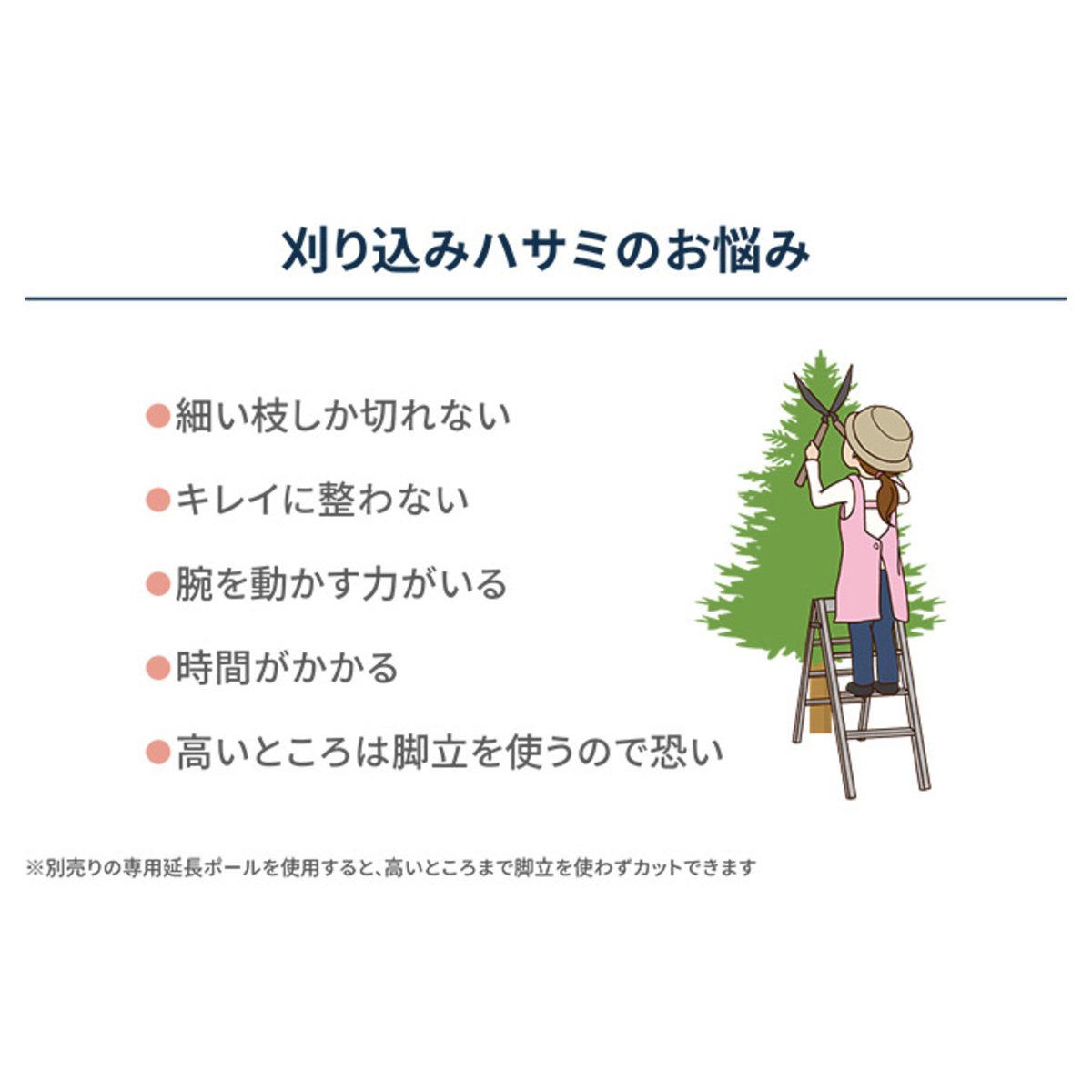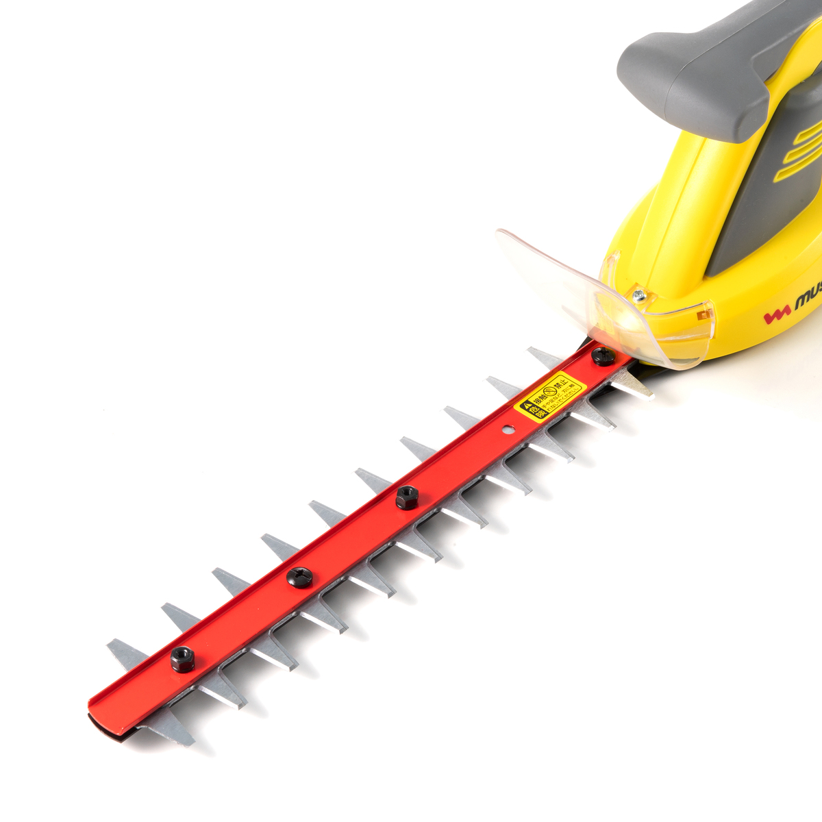 刈り込み幅は約250mm、最大切断径16mm(*2)。ストローク数は1700min-1(回/分)(無負荷時)で、ハードクロムメッキ、高炭素鋼の刃でしっかり切り取ります。別売りの伸縮延長ポールを取り付ければ、高い庭木の剪定や生垣の刈り込みも可能です
