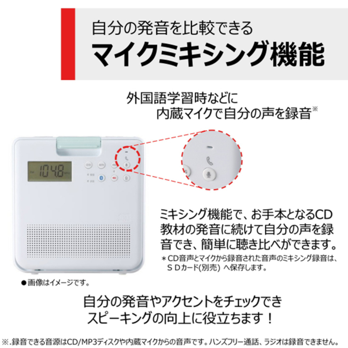内蔵マイクにCDとのミキシング機能付きで、お手本となるCD教材の発音に続けて自分の声を録音して聴き比べができます。CD音声とマイクから録音された音声のミキシング録音は、SDカード(別売)へ保存します