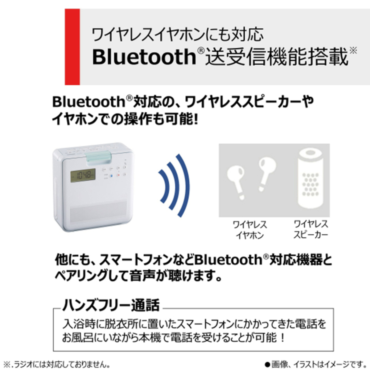 本体で再生したCD/SD音源を送信して、Bluetooth対応のワイヤレスイヤホンやスピーカー等で聞くことが可能。また、入浴時に脱衣所に置いたスマートフォンにかかってきた電話を、お風呂にいながら受けることができるハンズフリー通話機能も付いています