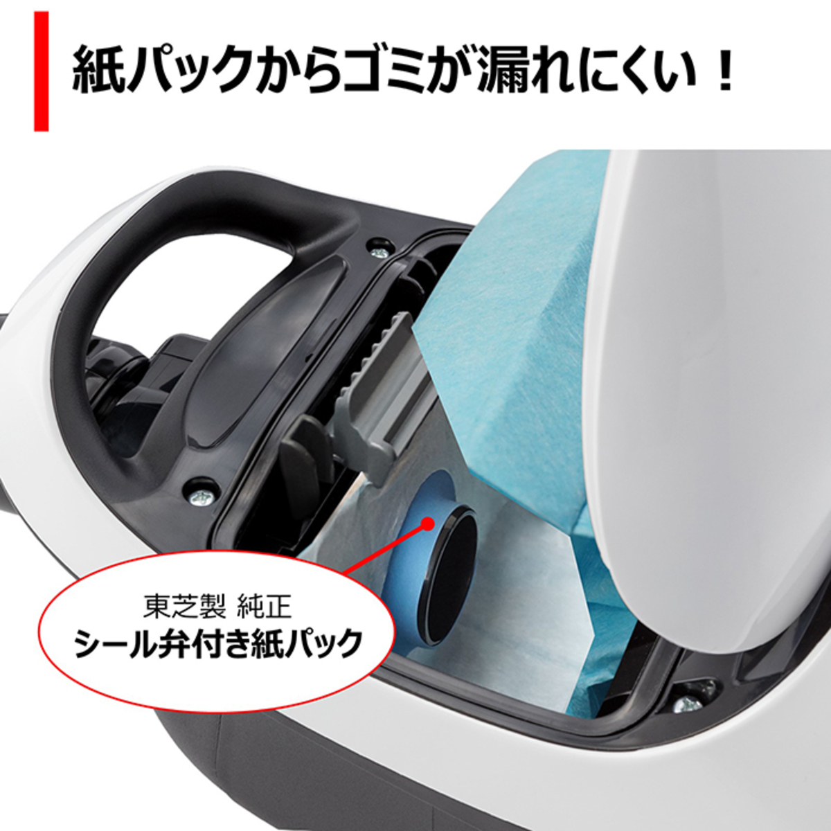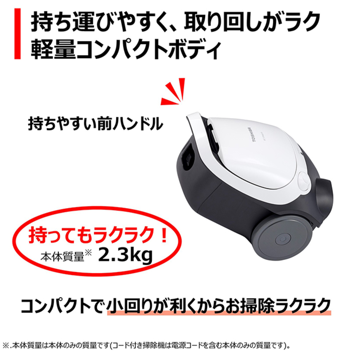 [商品内容] ・クリーナー本体 ・すき間ノズル ・ホース ・伸縮延長管 ・床ブラシ ・別売品用アタッチメント ・シール弁付トリプル紙パック(VPFー5) [サイズ] 幅21×奥行32.3×高さ19.4cm [重量] 本体:2300g 本体・ホース・延長管・ヘッド合計質量:3600g [集塵容量] 1200ml [コード長さ] 5m [消費電力] 約250W〜870W [使用方法] ・電源プラグをコンセントに差し込む ・強/弱またはecoモードを押す(お掃除開始) ・切を押す(運転を止めるとき) ・お掃除が終わったら電源プラグをコンセントから抜く [お手入れ] ※お手入れ前には「切」を押し、電源プラグをコンセントから抜いて下さい <本体・ホース・伸縮延長管> ・水を含ませた布でふく すき間ノズル ・水洗いして十分に乾かす <排気清浄フィルター> 1、排気清浄フィルターを取りはずす 2、押し洗いし、陰干しで乾かす 3、フィルター枠に排気清浄フィルターをはめる 4、本体に取り付ける <床ブラシ> 1、お手入れカバー、回転部をはずす 2、ゴミを取り除く 3、回転部、お手入れカバーを取り付ける [注意事項] ※電源・電源プラグ・電源コードは正しく使う ※電源コード・電源プラグが傷んだり、コンセントの差し込みがゆるいときは使わない ※電源コードを傷つけない、無理に曲げない、引っ張らない、ねじらない、束ねない、加工しない、重いものを載せない、はさみ込まない ※電源コードを床ブラシの回転部に巻き込まない ※電源プラグはぬれた手で拭きさししない ※電源プラグを抜くときは、電源コードを持たずに必ず先端の電源プラグを持って抜く ※電源コードは、まっすぐ引き出す ※クリーナーを使わないときは、電源プラグをコンセントから抜く ※電源は交流100V定格15A以上のコンセントを単独で使う ※延長コードは使わないで下さい ※電源プラグとコンセントのホコリなどはプラグを抜き、定期的に乾いた布でふき取る ※電源プラグは根本まで確実に差し込む ※紙パックの交換時やお手入れのときは、必ず電源プラグをコンセントから抜く ※水洗いや、風呂場などの水まわりでの使用は絶対にしない(水洗いできる部品は除く) ※ふたが開いているときは、ふたを持って本体を持ち上げない ■取り扱い説明を充分にご確認の上、ご使用下さい 【中国製】 ※床ブラシ裏面の回転部などや、本体の排気口付近には触れない ※吸気口をふさいで長時間運転しない ※排気口をふさがない ※本体にあるホース差込口の接点にピンや金属類などを入れない ※破れや傷のあるホースは使わない ※火気に近づけない ※紙パック・排気清浄フィルター・フィルター枠は正しく取り付ける。フィルターが破れたり、古くなったときは交換する ※シール弁付東芝製純正紙パックを使う ※ホースを持って本体を持ち上げない ※本体に乗らない ※電源コードを巻き取るときは、電源プラグを持って行う ※本体を運ぶときは、必ずハンドルを持つ ※灯油、ガソリン、シンナー、可燃性ガスなどの引火性のあるもの、タバコの吸い殻など火の気のあるもの、トナーなどの可燃物、じゅうたん洗浄剤などの泡状のものの近くで使用しない、吸わせない ※ふたを閉めずに運転しない ※通風口に棒などを入れない ※絶対に改造はしない。また、修理技術者以外の人は、分解したり修理しない ※異常・故障時にはすぐに使用を中止する ※業務用に使わない、掃除以外に使わない