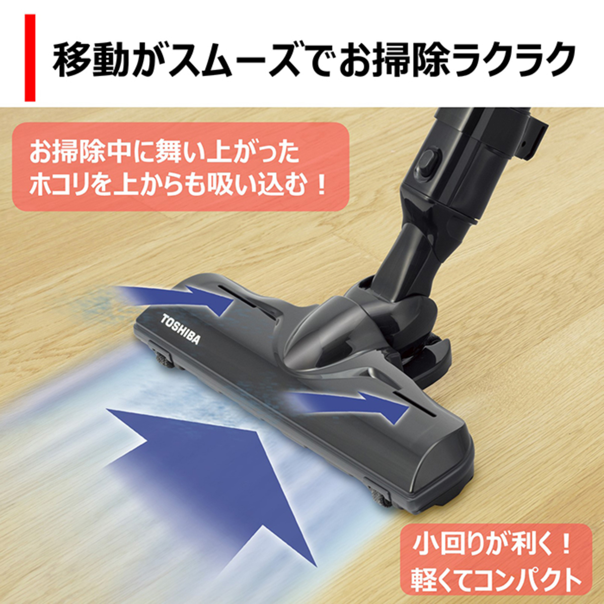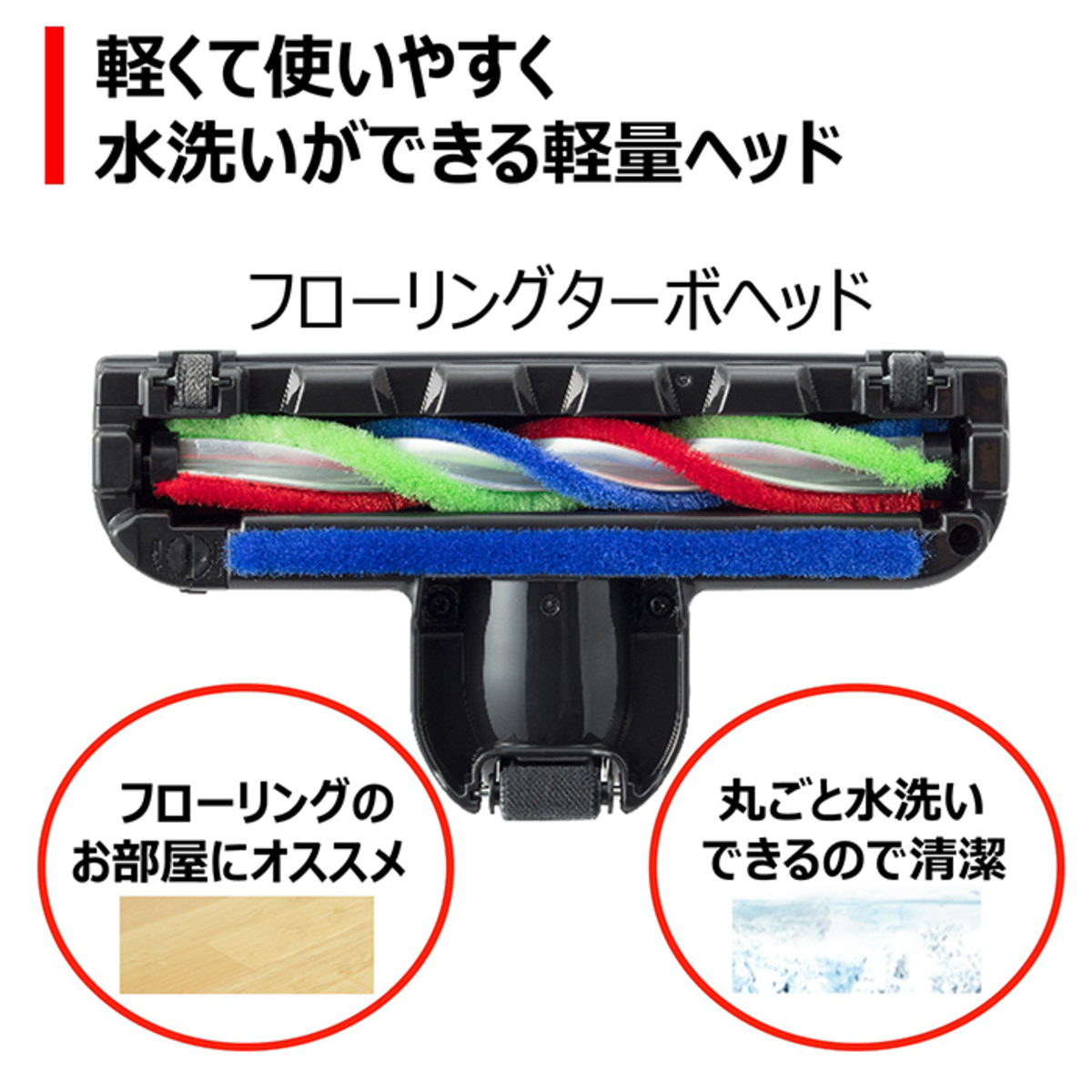らくわざグリップはまっすぐ握ることができ、ひねりもラクにできるので、方向転換がスムーズ。壁際などもきれいにお掃除することができます。また、軽くて移動もスムーズなヘッドを採用。フローリングのお部屋におすすめです