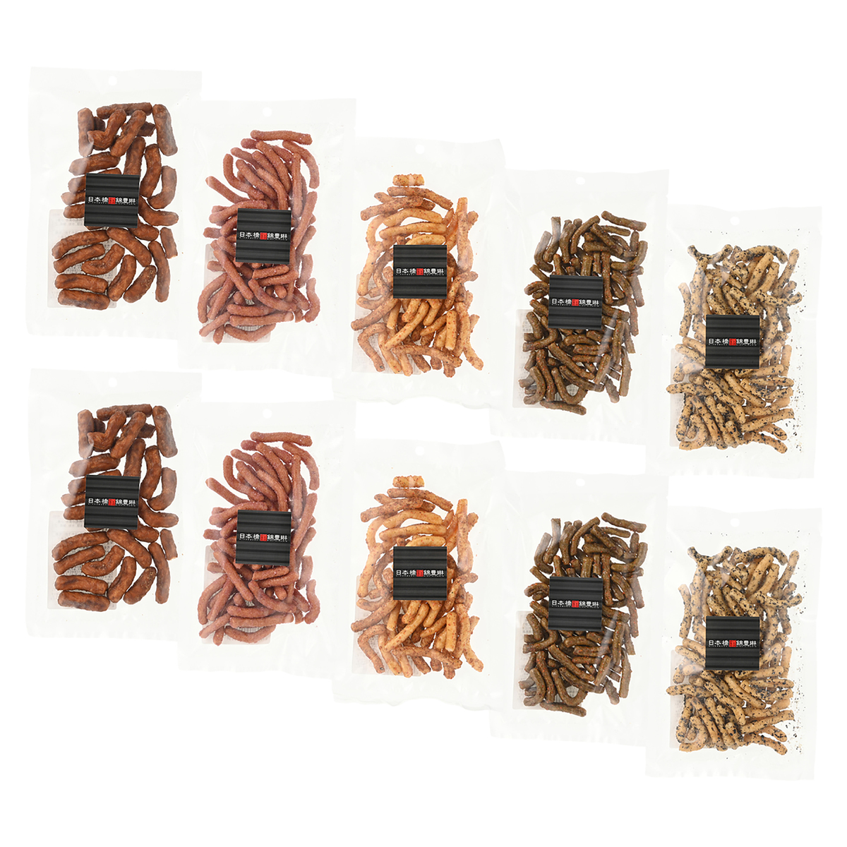 [アレルギー物質特定原材料8品目] 小麦 [商品内容] ・きんぴらごぼうかりんとう ・黒糖かりんとう ・胡麻かりんとう ・むらさきいもかりんとう ・七味山椒かりんとう 各65g×2袋/計10袋 [賞味期限] 出荷時点で賞味期限まで35日以上ある商品をお届けします [保存方法] 開封前:直射日光及び高温多湿を避けて常温で保存してください 開封後:開封後はお早めにお召し上がりください [注意事項] ※本品は未開封の状態でも、直射日光や高温多湿の場所に置いておかれますと、表面の糖蜜が溶けて、べとついて湿気たり、固まったりする原因となります [原料原産地] 小麦粉(小麦(国産)) [加工地] 日本 [原材料] きんぴらごぼうかりんとう:小麦粉(小麦(国産))、植物油脂、砂糖、水飴、乾燥ごぼう、醤油(大豆を含む)、酵母、七味唐辛子(ごまを含む)、小麦繊維、食塩/香料、炭末色素 黒糖かりんとう:小麦粉(小麦(国産))、黒砂糖、植物油脂、水飴、酵母、ごま、食塩 胡麻かりんとう:小麦粉(小麦(国産))、植物油脂、砂糖、ごま、水飴、醤油(大豆を含む)、酵母、食塩 むらさきいもかりんとう:小麦粉(小麦(国産))、砂糖、植物油脂、砂糖、水飴、紫芋粉末、酵母、蜂蜜、ごま/香料 七味山椒かりんとう:小麦粉(小麦(国産))、植物油脂、砂糖、水飴、醤油(大豆を含む)、食塩、七味唐辛子、山椒、酵母、ごま/香料
