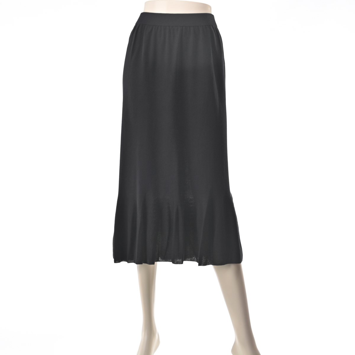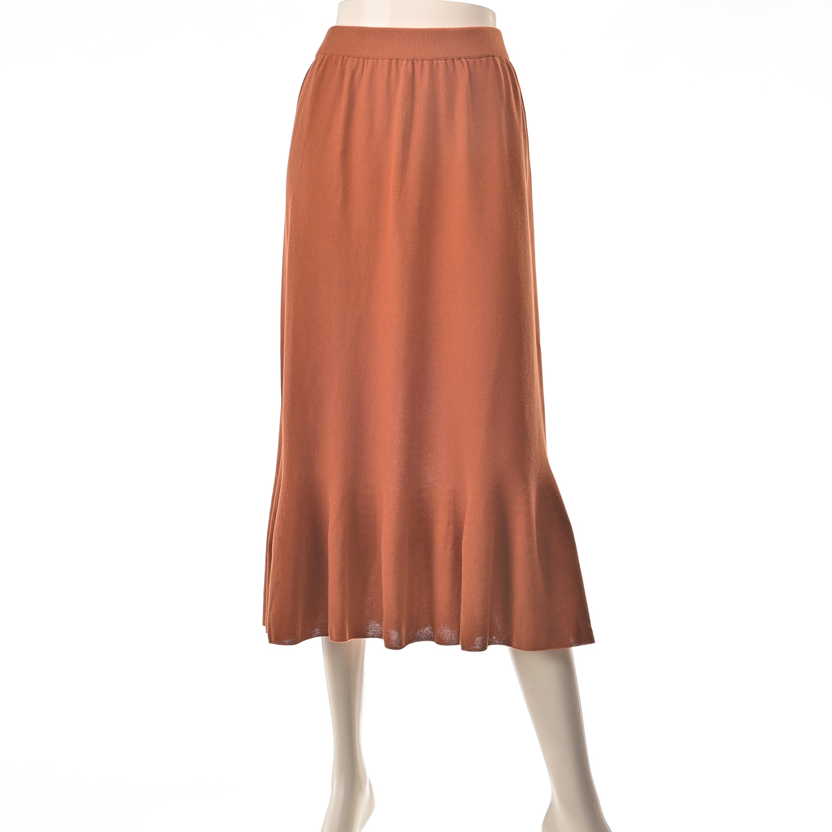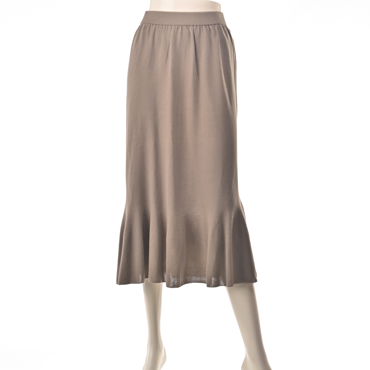 レギーナさんがとても素敵に着こなしていたので数色購入しようと思ったのですが、 動いている時のシルエットはまあ良いのですが、真直ぐ立つと下のフリルの部分がぼわんと膨らんで中途半端な雰囲気に。 マーメイドラインというのは似合う人が限られるかも。 ホールガーメントで着易いので、別のデザインのスカートがあったら試したいと思います。 個人的にはたっぷりした体形を拾わない長めのギャザーAラインがあればいいなと思います。