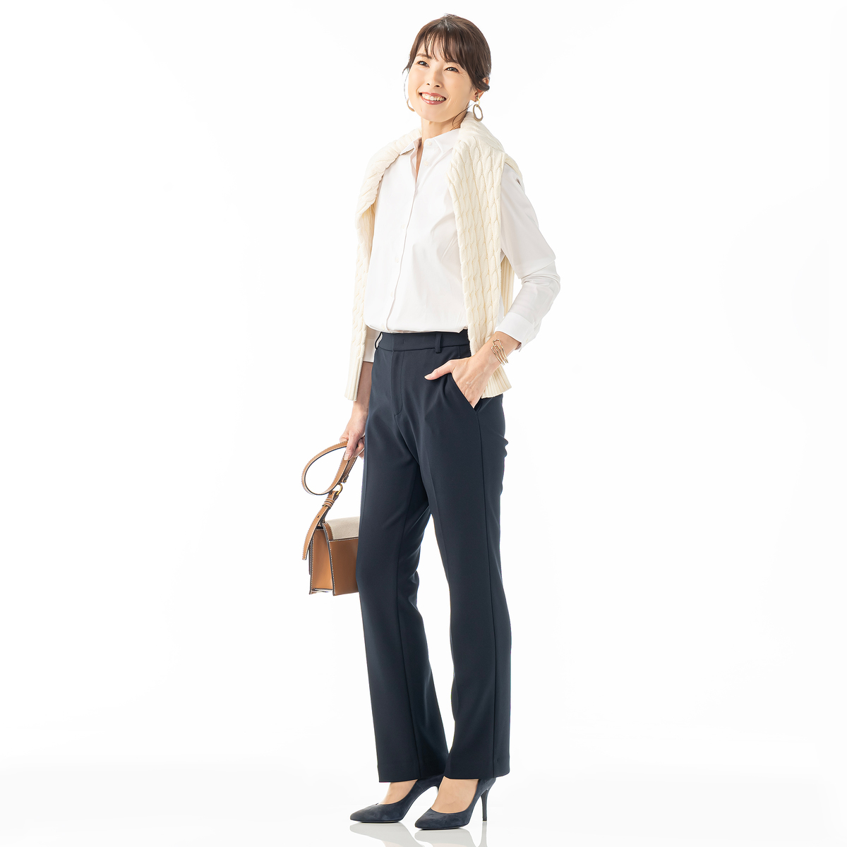 ズボンの横から見たラインは、とても綺麗で、履いていて楽ですが、少し重さが気になりましたが、しっかりしていて落ち感があり、キレイめに履けるので購入して良かったです。 次の放送も見て、リピートしたいです。