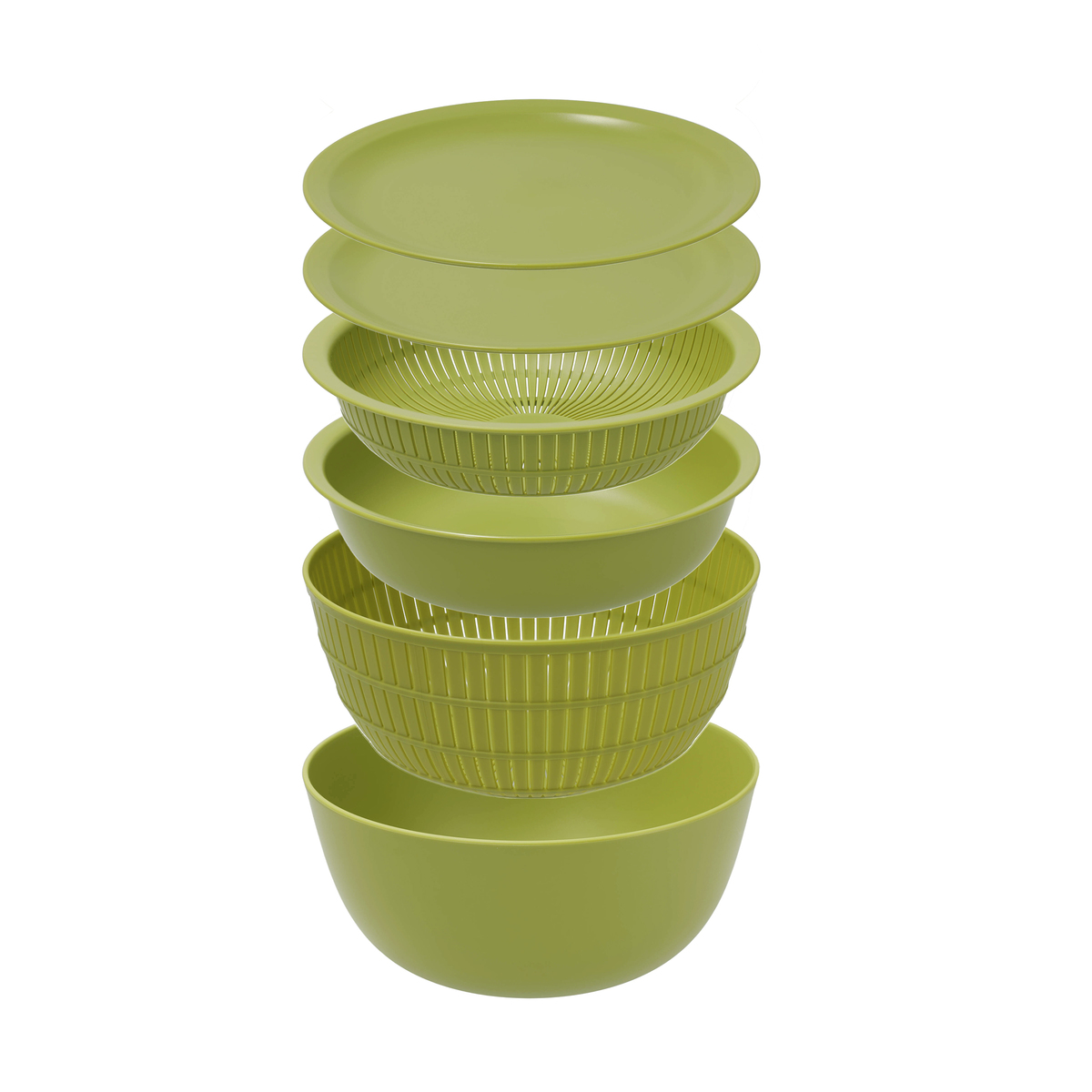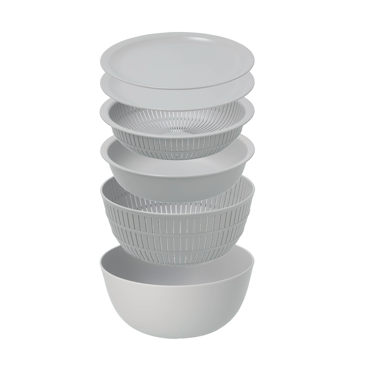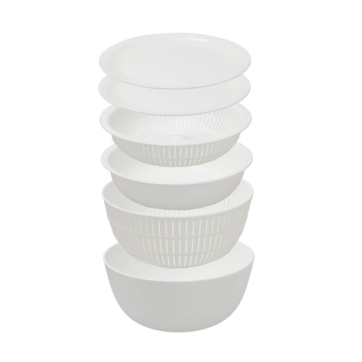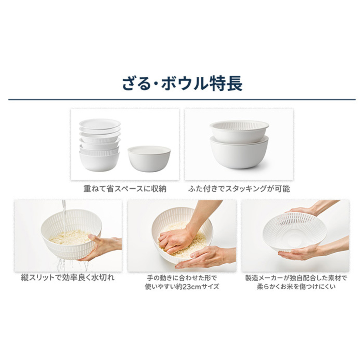 [セット内容] ・ボウル深型・ボウル浅型・ザル深型・ザル浅型・プレート×2 <ボウル深型> [サイズ]約直径23.3×高10.7cm [重量]約220g [容量]約3200ml <ボウル浅型> [サイズ]約直径23.6×高6.3cm [重量]約167g [容量]約1800ml <ザル深型> [サイズ]約直径22.7×高10.4cm [重量]135g <ザル浅型> [サイズ]約直径23.6×高5.9cm [重量]約111g <プレート> [サイズ]約直径23.6×高1.6cm [重量]約119g <共通> [材質] ザル:ポリプロピレン、熱可塑性エラストマー ボウル、プレート:ポリプロピレン [お手入れ] ※最初に使われる際は、食器用中性洗剤で洗ってからご使用ください ※お手入れの際は、シンナー、ベンジン等はご使用にならないでください。たわし、または磨き粉で磨くと、傷が付くことがあります [注意事項] ※使用可:食器洗い機、電子レンジ ※火のそばに置かないでください ※電子レンジ、食器洗い乾燥機をご使用の際は、それぞれの取扱い説明書に従ってお使いください ※熱湯を扱う際は、やけどには十分ご注意ください ※用途以外のご使用は、おやめください 【日本製】