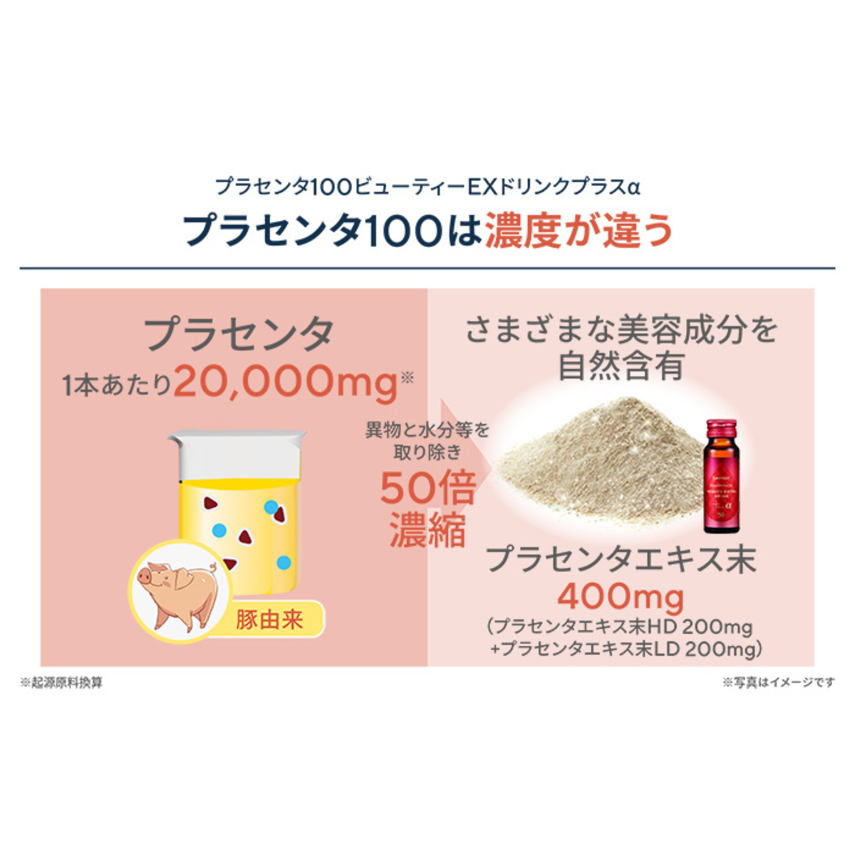 *2)これらの原料は製造工程において、約50kgの起源原料(プラセンタ)を濃縮し約1kgのプラセンタエキス末を製造。この事から、2種類のプラセンタエキス末の配合量計400mgを起源原料(プラセンタ)に換算すると約20,000mgとなります