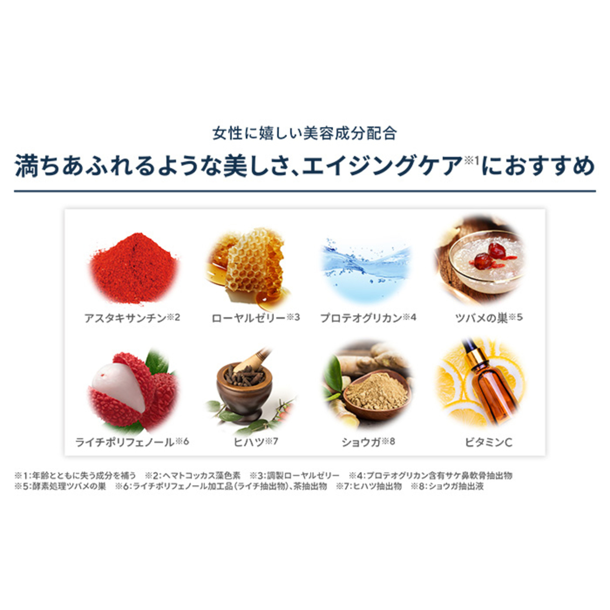 美容成分のアスタキサンチン(ヘマトコッカス藻色素)を配合(*3)。ツバメの巣(酵素処理ツバメの巣)、ローヤルゼリー(調製ローヤルゼリー)、ヒハツ(ヒハツ抽出物)、ライチポリフェノール(ライチポリフェノール加工品)、プロテオグリカン(プロテオグリカン含有サケ鼻軟骨抽出物)、ショウガ(ショウガ抽出液)、ビタミンCも配合しています