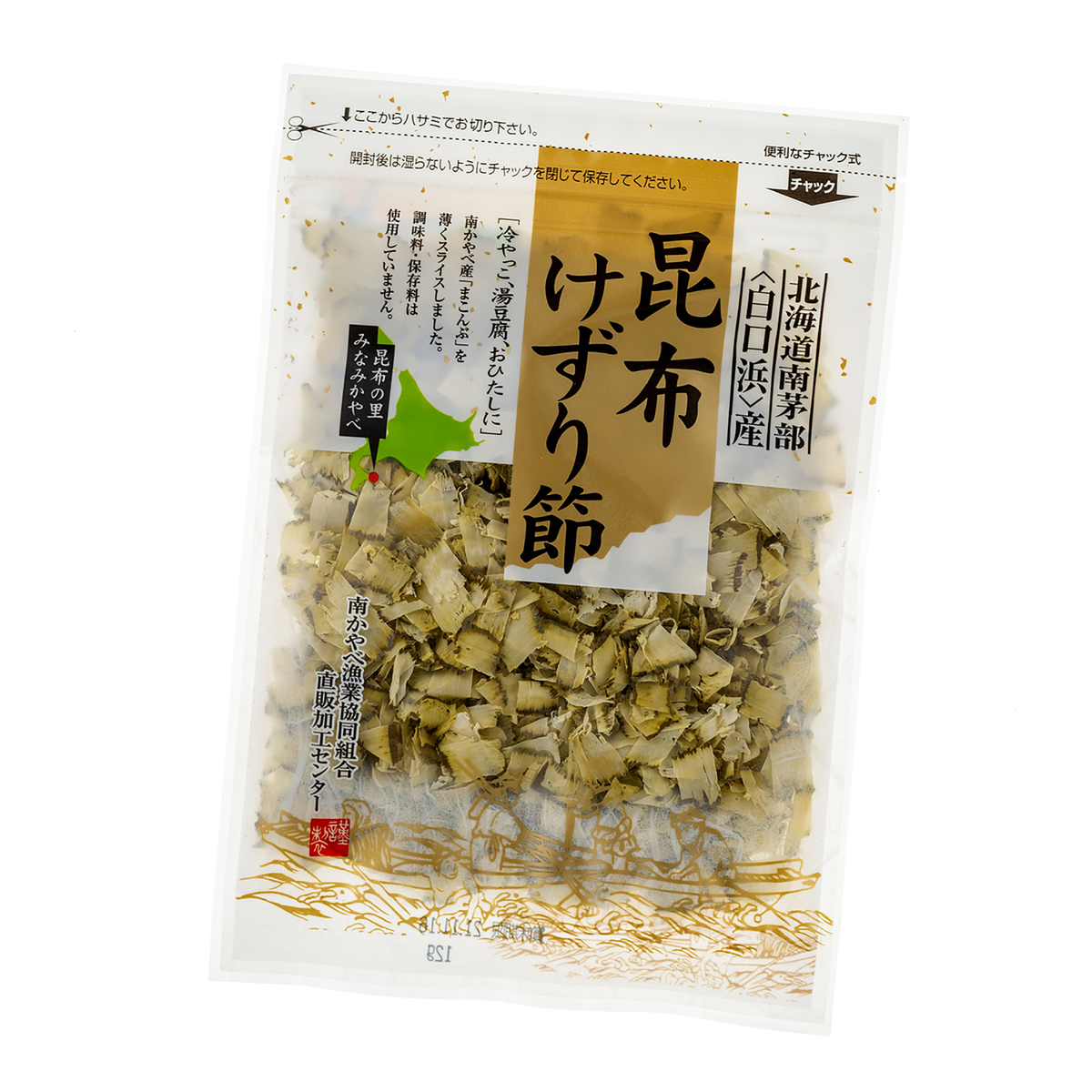 北海道南かやべ産の"まこんぶ"を使用した昆布けずり節。冷やっこや湯どうふ、おひたし、お好み焼き等にふりかけたり、和・洋・中様々なお料理の調味料として幅広くご利用いただけます