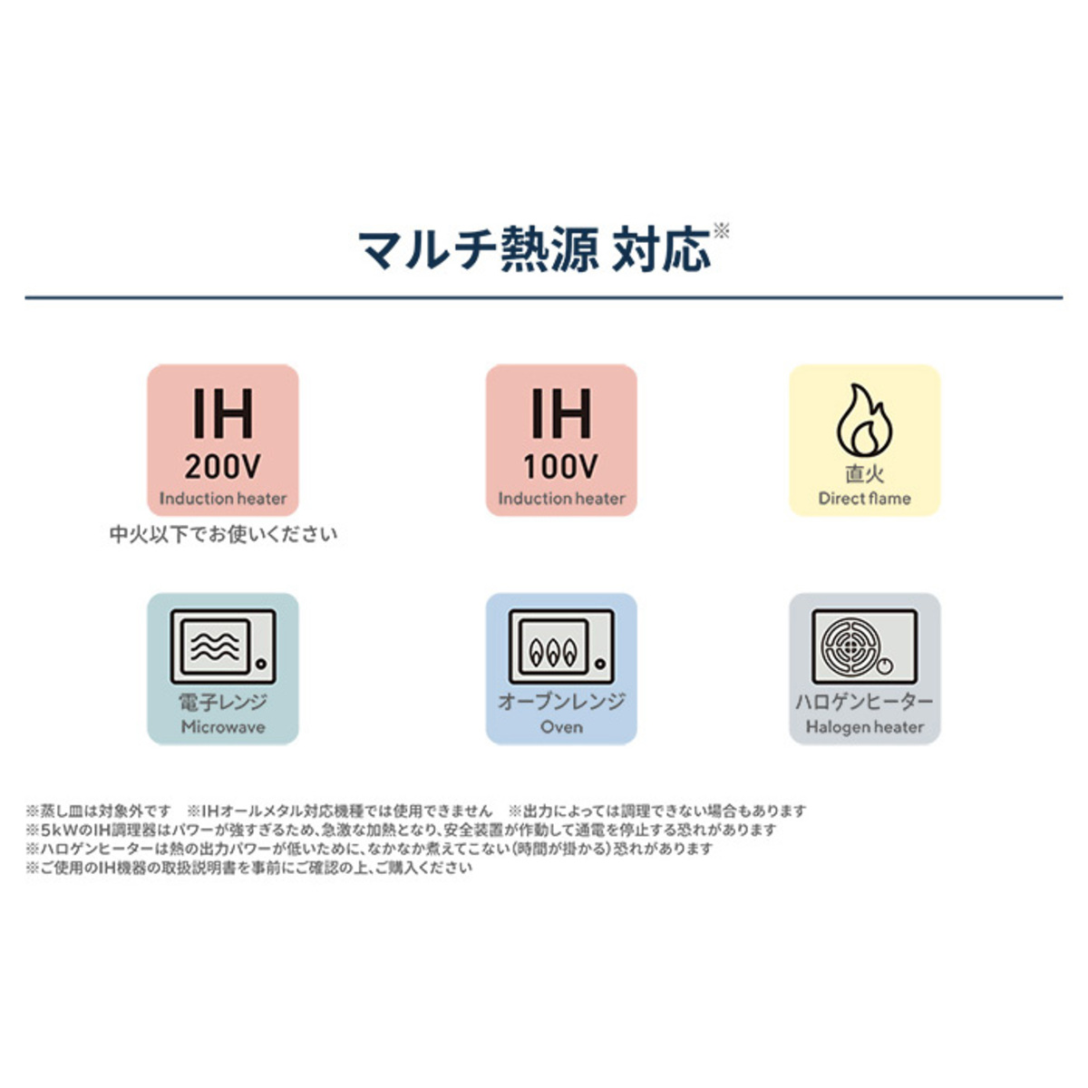 *2)オールメタルIH(オールメタル対応機種)では使用できません。IH200Vで使用の際は、火力調整を必ず「中」以下で使用してください。IH調理器の機種によっては調理できないものや、調理器を破損する場合があります
