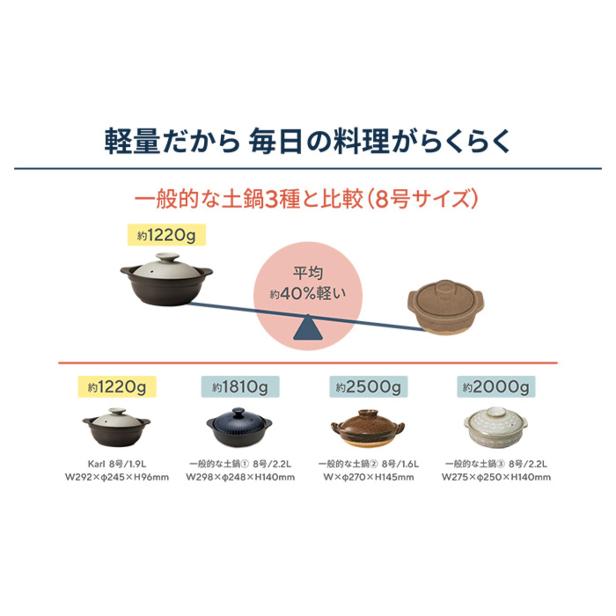 製造元の高い技術、メーカーのこれまで業務用製品開発で培った知識と経験により土鍋なのに驚くほどの軽さを実現。棚からの出し入れやお手入れする時も、らくらくで扱いやすいのが魅力です
