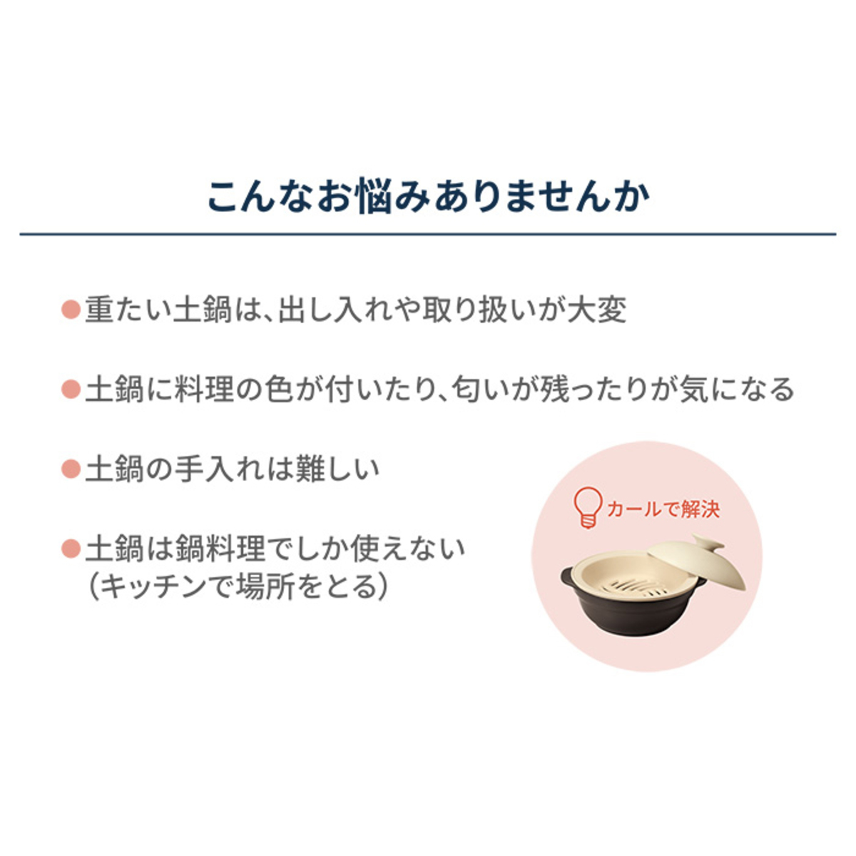 家庭で気軽に使っていただける、軽量(*1)な土鍋。これ一つで鍋料理はもちろん、煮込む、焼く、炊く、蒸す等バラエティ豊かな料理が楽しめます。IH(*2)をはじめ、ガス火、ハロゲンヒーターの熱源にマルチに対応(*3)しています