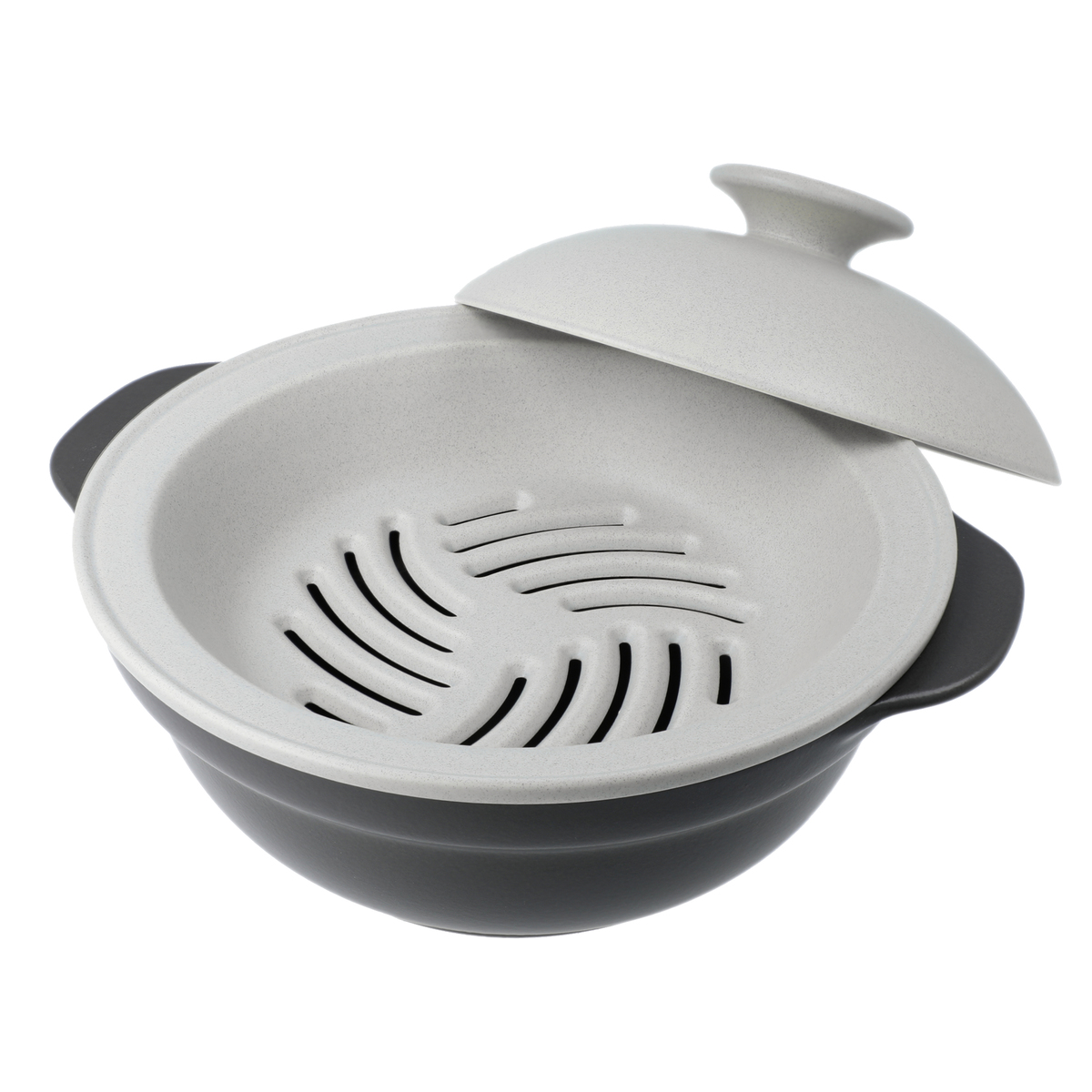 [商品内容] ・IH土鍋 ・蒸し皿 [サイズ] 本体:幅29.2×直径24.5×高さ9.5cm フタ:直径22.7×高さ7.8cm 蒸し皿:直径25.4cm [重量] 1800g [容量] 1900ml [材質] 本体:高耐熱セラミック フタ・蒸し皿:硬質陶器 ■IH200V迄・電気調理器 対応可 【マレーシア製】 [注意事項] ※使用可:電子レンジ、オーブンレンジ、直火 ※使用不可:食器洗い機 ※本体はIH、直火ともに可能ですが、蓋、蒸し皿は直火不可です ※本体は食洗器不可ですが、蓋、蒸し皿は食洗器可能です ※使用頻度や年月に関わらず、使用状況によっては鍋裏面の発熱体が破損し、IH調理器でお使いいただけなくなる場合があります ※取扱説明書に従わない使用方法で起こった不具合には、ご相談に応じかねますのでご了承ください ※Siセンサー付きガスコンロで使用できない場合は、Siセンサーを解除し十分注意しながらご使用ください ※IH調理器カバーのようなものを使用すると、鍋の温度検知が正確にできなくなり、非常に危険ですので使用しないでください。またシリコン等樹脂製のIH調理器カバーは、溶ける恐れもありますので使用しないでください ※ふちまで水等を満たした状態で使用しないでください。ふきこぼれ、やけどの原因になります ※調理物が底に焦げつかないように、調理器の火力を調整し、よくかき混ぜてご使用ください。焦げつきを繰り返しますと発熱体の破損の原因になります ※加熱中、加熱後は、鍋本体及び、取っ手の部分やフタのつまみ部分も熱くなります。鍋に触れる際には、必ずミトンなどを使いやけどにご注意ください ※IH調理器での加熱後は、鍋裏面の発熱体部分が特に高温になります。テーブルなどに置く際には、耐熱性の高い鍋敷き(金属製・木製・陶器製)を鍋の高台部分に接するように用い、紙や布など可燃物の上には置かないでください。なお、木製・コルク等の鍋敷きは焦げる場合がありますのでご注意ください ※加熱後の発熱体部分には素手で絶対に触らないでください ※鍋の空焚きや急冷はしないでください。鍋や発熱体の破損の原因になります ※オーブンをお使いになる場合は、フタを外してご使用ください。急な温度上昇により、破損する恐れがあります ※炒め物や焼き肉、天ぷら等の油料理には使用しないでください。万が一目に見えないひびが入っていた場合、火災の原因となる恐れがあります ※料理中に「ブーン」「ジー」といった音がすることがありますが異常ではありません。鍋の位置をずらすか置き直すと止まることがあります ※発熱体に吹きこぼれた煮汁や醤油等の汚れが付着すると、断線の原因となりIH調理器で使用できなくなる場合があります ※鍋はIH調理器の真ん中に置いて使用してください。ずらしておいた場合、局部的に異常加熱し危険です。また鍋や発熱体の破損の原因になります ※酸性の液体(酢、ドレッシング等)を入れ長時間放置しないでください。変色する恐れがあります ※ご使用になる前は、必ず各部に不具合がないことをご確認ください。亀裂や破損等の異常がある場合はご使用をおやめください ※はじめて使用する際に沸騰しないなどの不具合がございましたら、お買い上げのお店までご連絡ください ※この土鍋は、吸水をほとんどしないため、使い始めに「目止め」をする必要はありません。中性洗剤などで軽く洗ってからご使用ください ※200Vで使用の際は、火力調整を必ず「中」以下で使用してください。IH調理器の機種によっては調理できないものや、調理器を破損する場合があります ※本製品は陶磁器です。落としたりぶつけたりすると破損する恐れがあります。特に底は薄くつくられていますので、お取り扱いには十分ご注意ください ※鍋の中に長時間料理を保存したり、鍋を水の中につけたまま放置しないでください。水を含んだまま空焚きをすると破損の原因になります ※土鍋を洗浄する際は、発熱体を傷つけないように柔らかいスポンジと中性洗剤をご使用ください。十分に乾燥させてから収納してください ※研磨剤の入った洗剤・金属製のスポンジ等は表面を傷つけるので使用しないでください ※土鍋本体は食器洗浄機は使用しないでください。発熱体が劣化する原因になります ※フタ、蒸し皿は食器洗浄機使用可能ですが、直接火にはかけないでください ※落下による破損や怪我を防ぐために、低い位置に収納してください