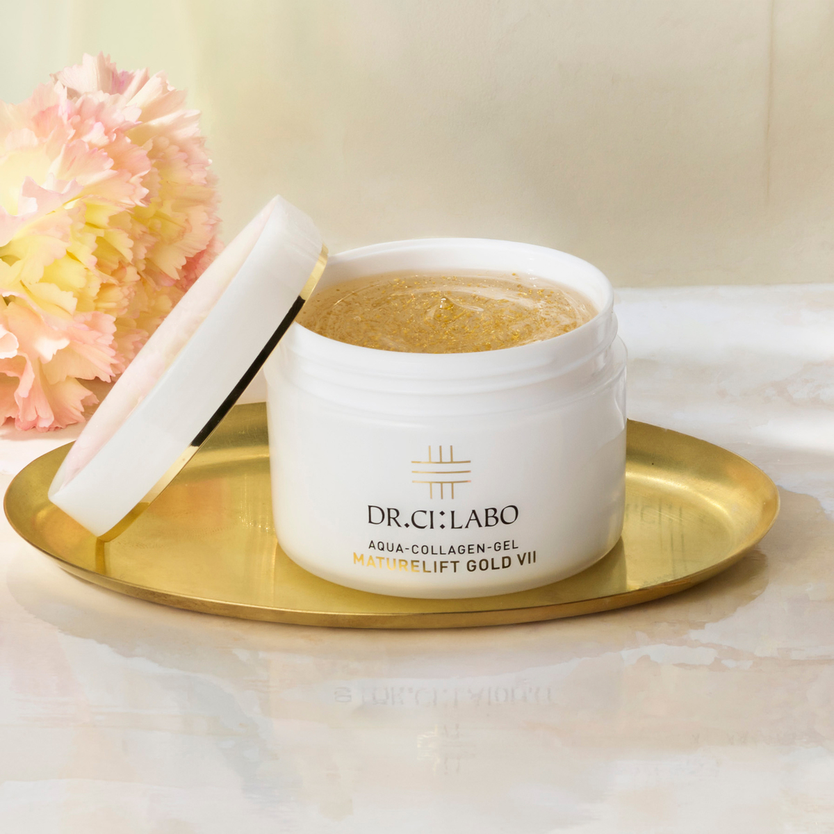 透明なゲルの中には、24金の金箔(金)や黄色い粒のカプセルに入ったCoQ10(ユビキノン)のほか、マイクロペプチド-D108(*1)・酵母エキス・ナイアシンアミド・水溶性プロテオグリカンも配合*2。ハリ・弾力、潤い、ツヤ、キメの整った若々しいお肌を目指します