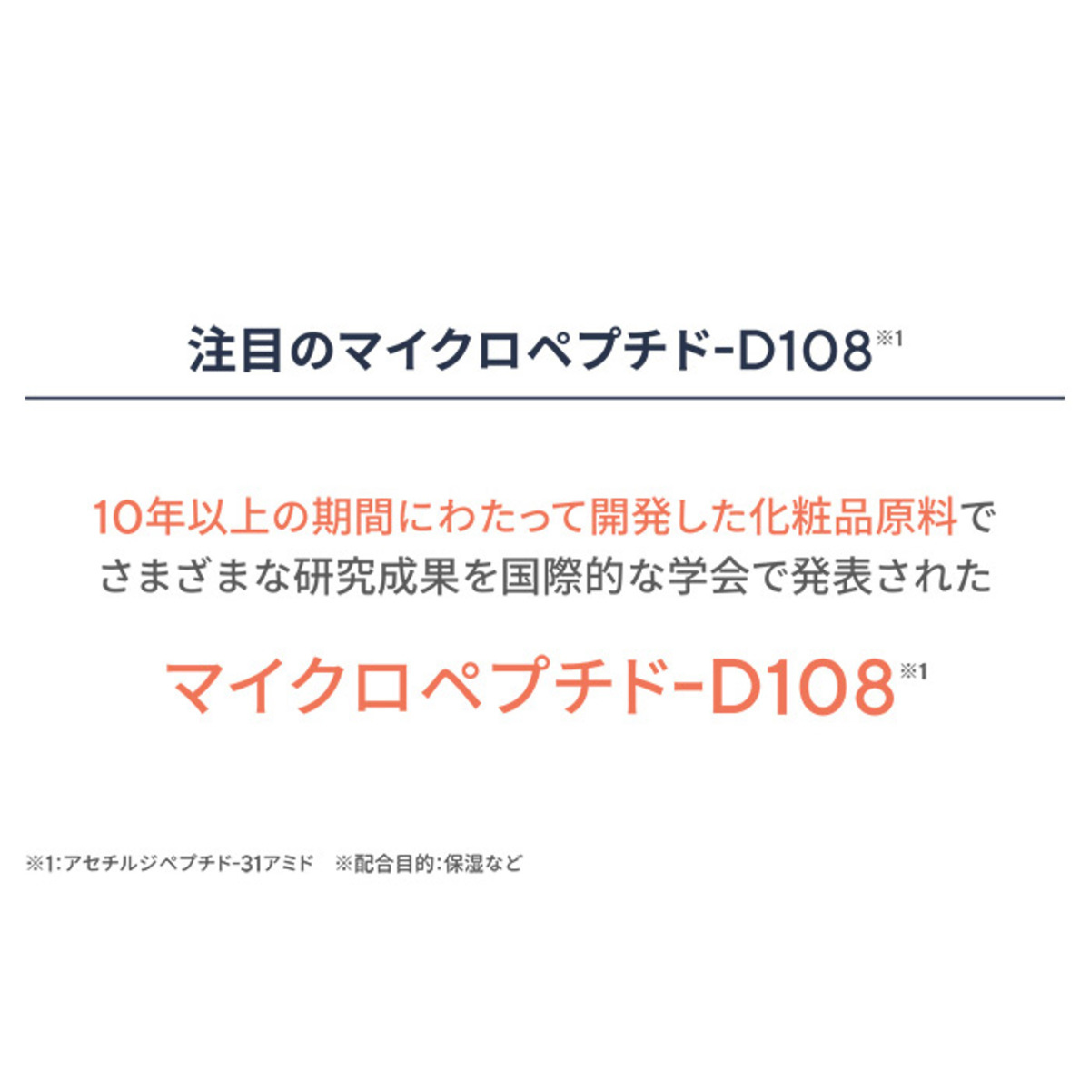 *1)マイクロペプチド-D108:アセチルジペプチド-31アミド 配合目的:保湿等