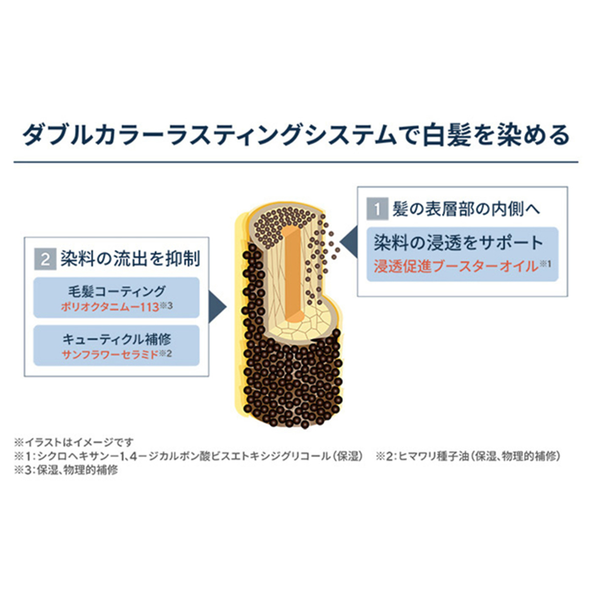 毛髪表層部の内側に浸透して染毛していくHC染料(*2)と、キューティクルの外側を染毛する塩基性染料(*3)の2種類の染料を使用(*1)。浸透促進ブースターオイル(*4)が毛髪の表層部の内側への染料(*2)(*3)の浸透をサポート。毛髪をコーティングするポリクオタニウム-113(*5)と、キューティクルを補修するサンフラワーセラミド(ヒマワリ種子エキス)(*5)によって、染料の流出を抑制します