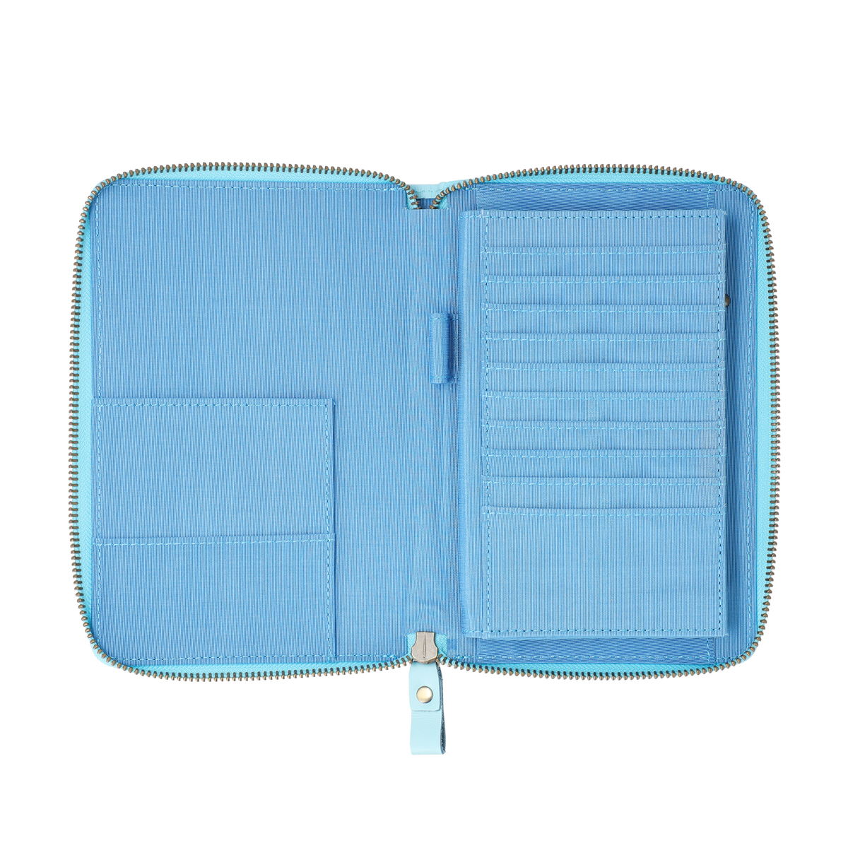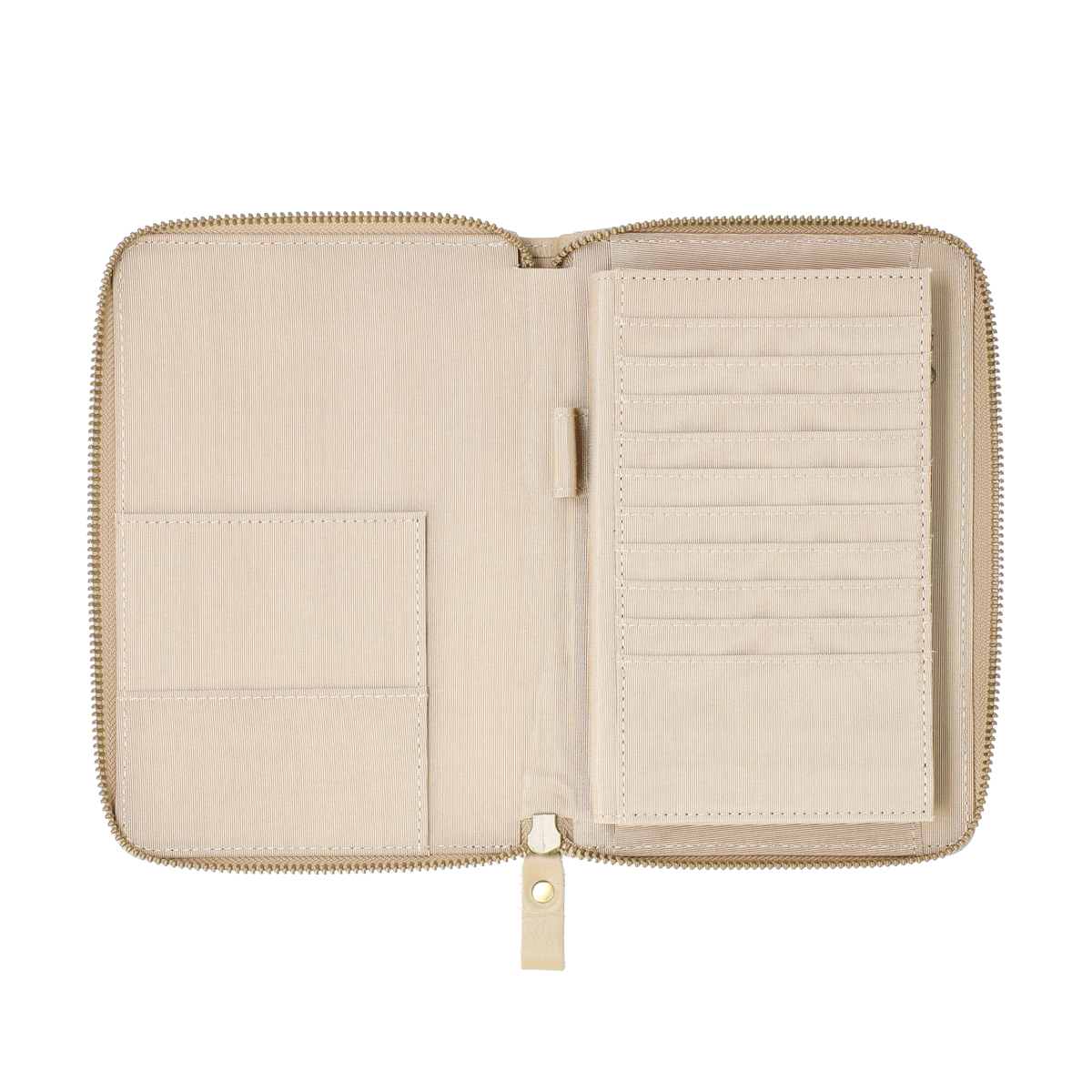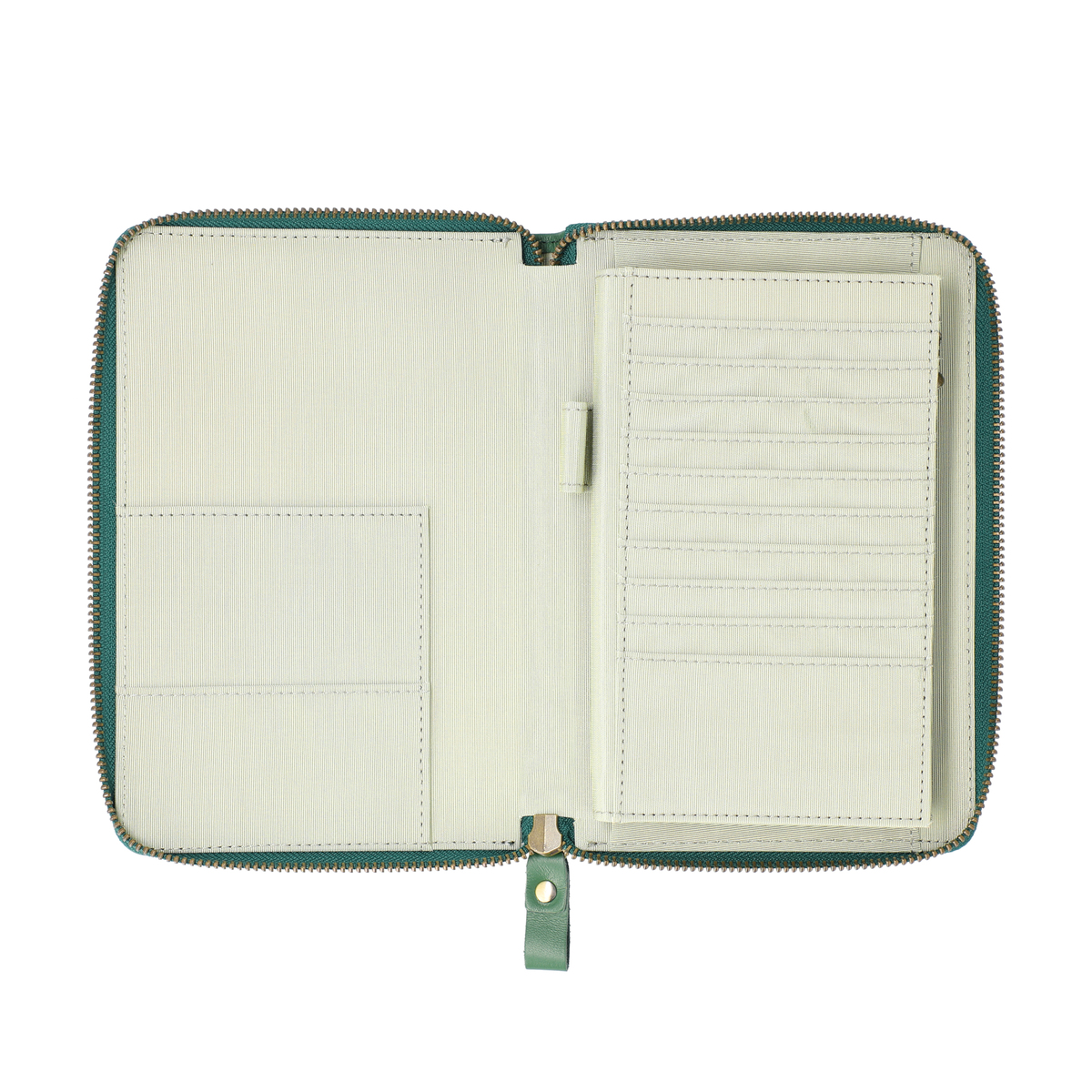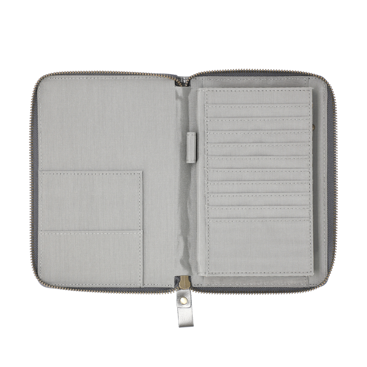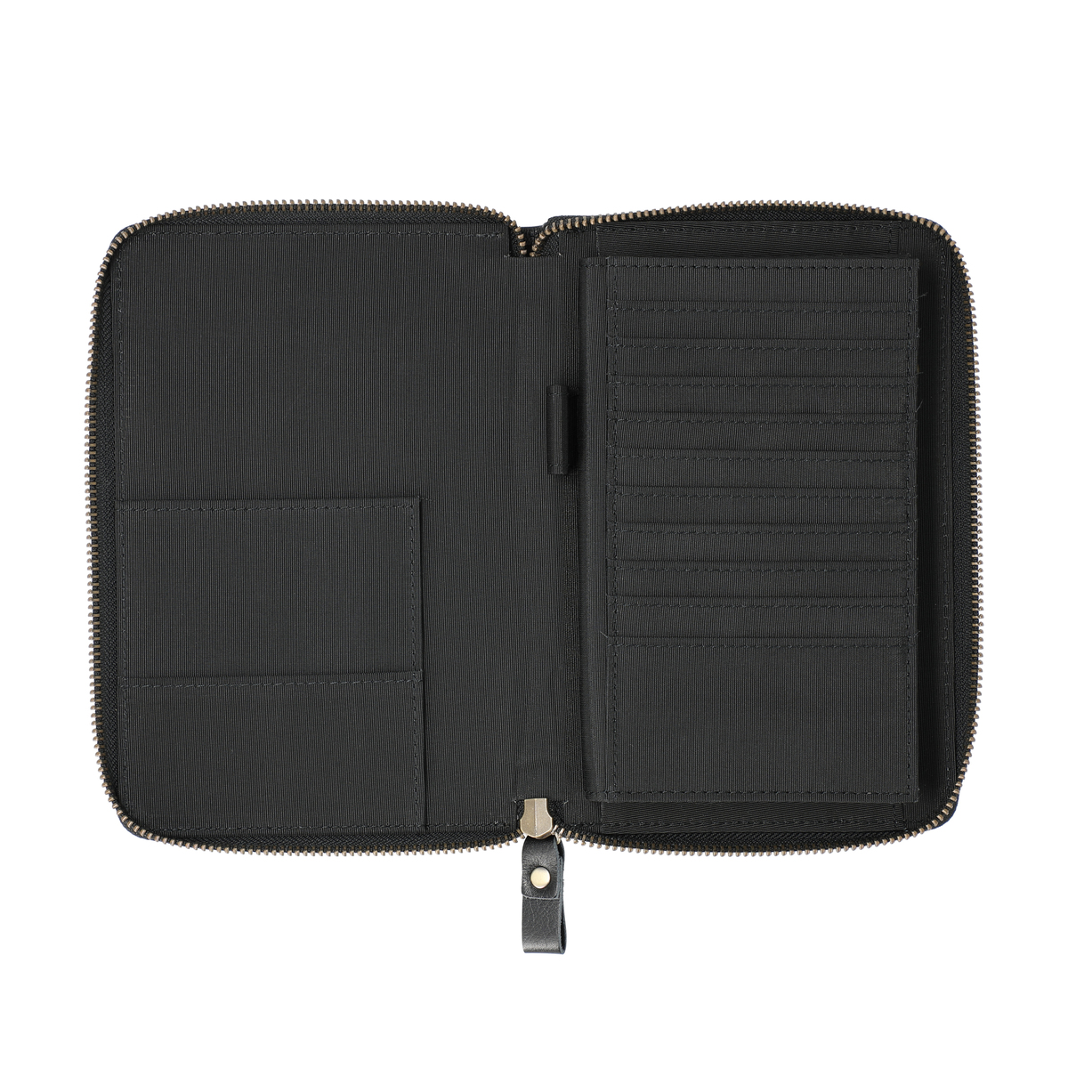 よく使う保険証は、お薬手帳を収納する下にあるカード入れに収納。便利なペン差しもついています。たっぷり収納できるカード入れや、マチ付きのオープンポケットを設置。L字に開閉できるファスナーの内側は4つに仕切られ、処方薬などを分けて収納することもできます