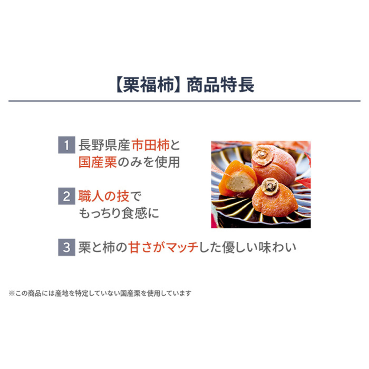 干し柿には市田柿を使用。もっちりした食感と口に広がる上品な甘さは、市田柿ならではの味わいです。栗のホクホク感と柿のしっとりとした甘さの絶妙なバランスが何故かなつかしく、素朴な中にも優しい味を生み出しています