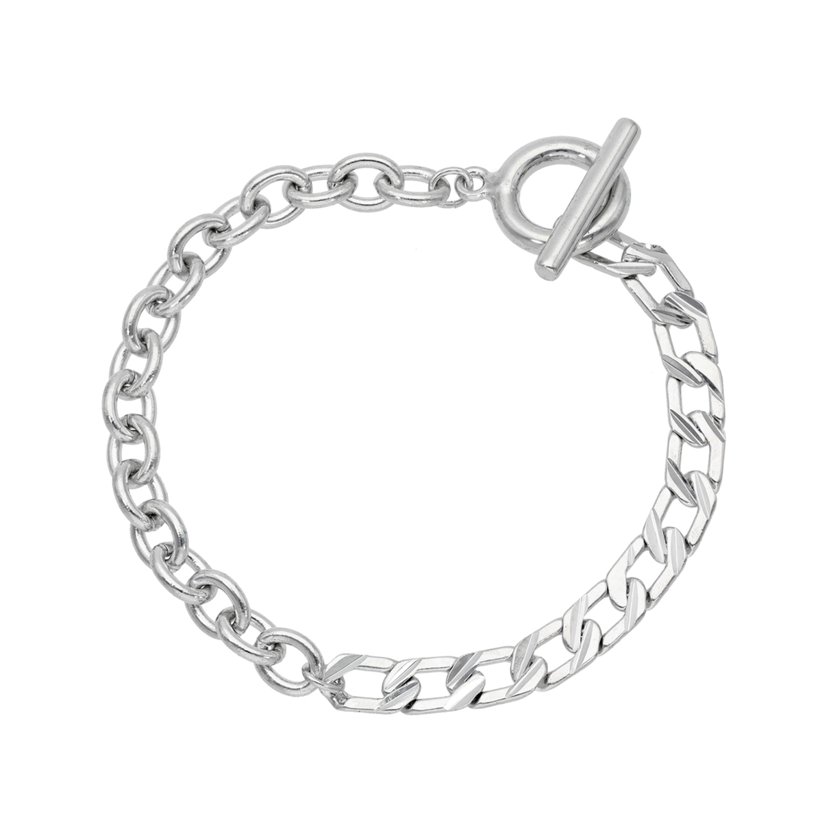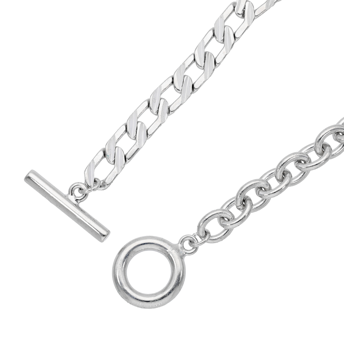 2種類のチェーンを組合せたブレスレット。異なるチェーンのコントラストで、スタイリッシュな雰囲気に。お手元に映えるほどよいボリューム感です