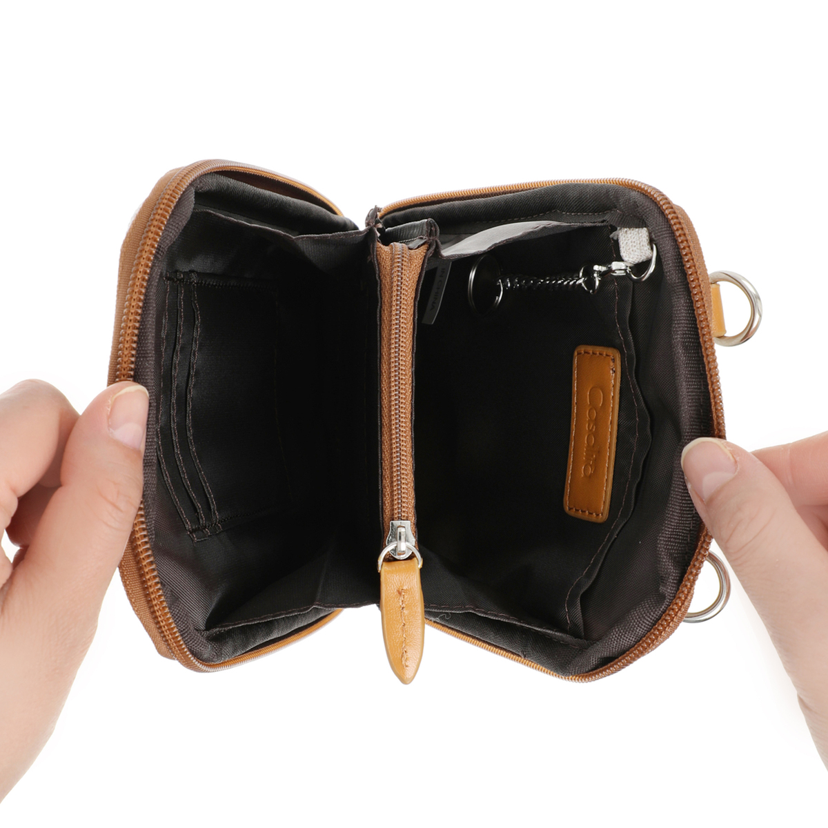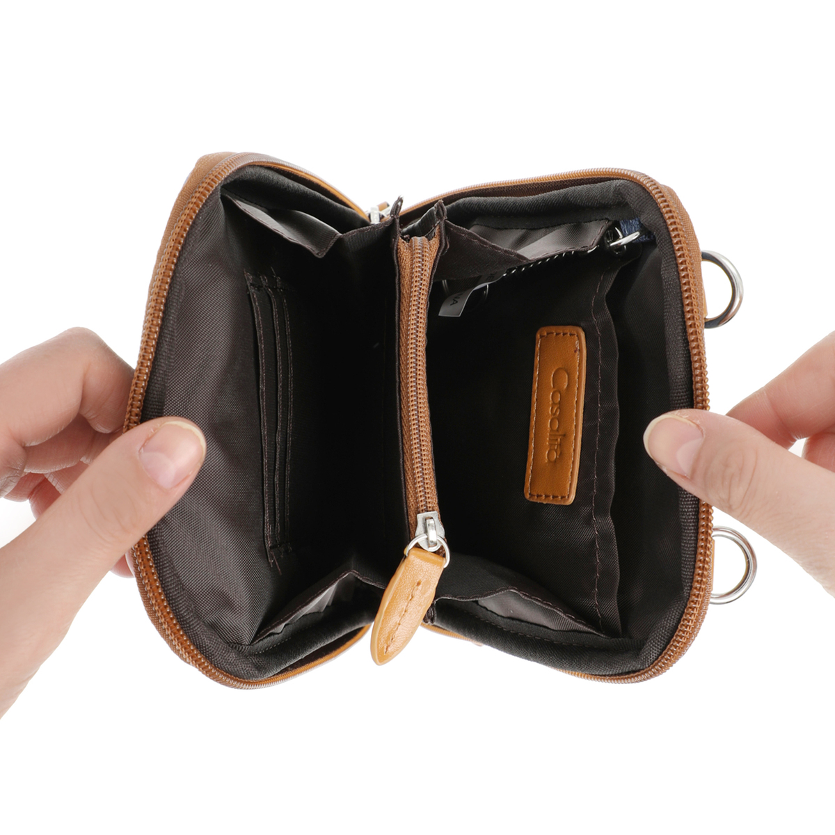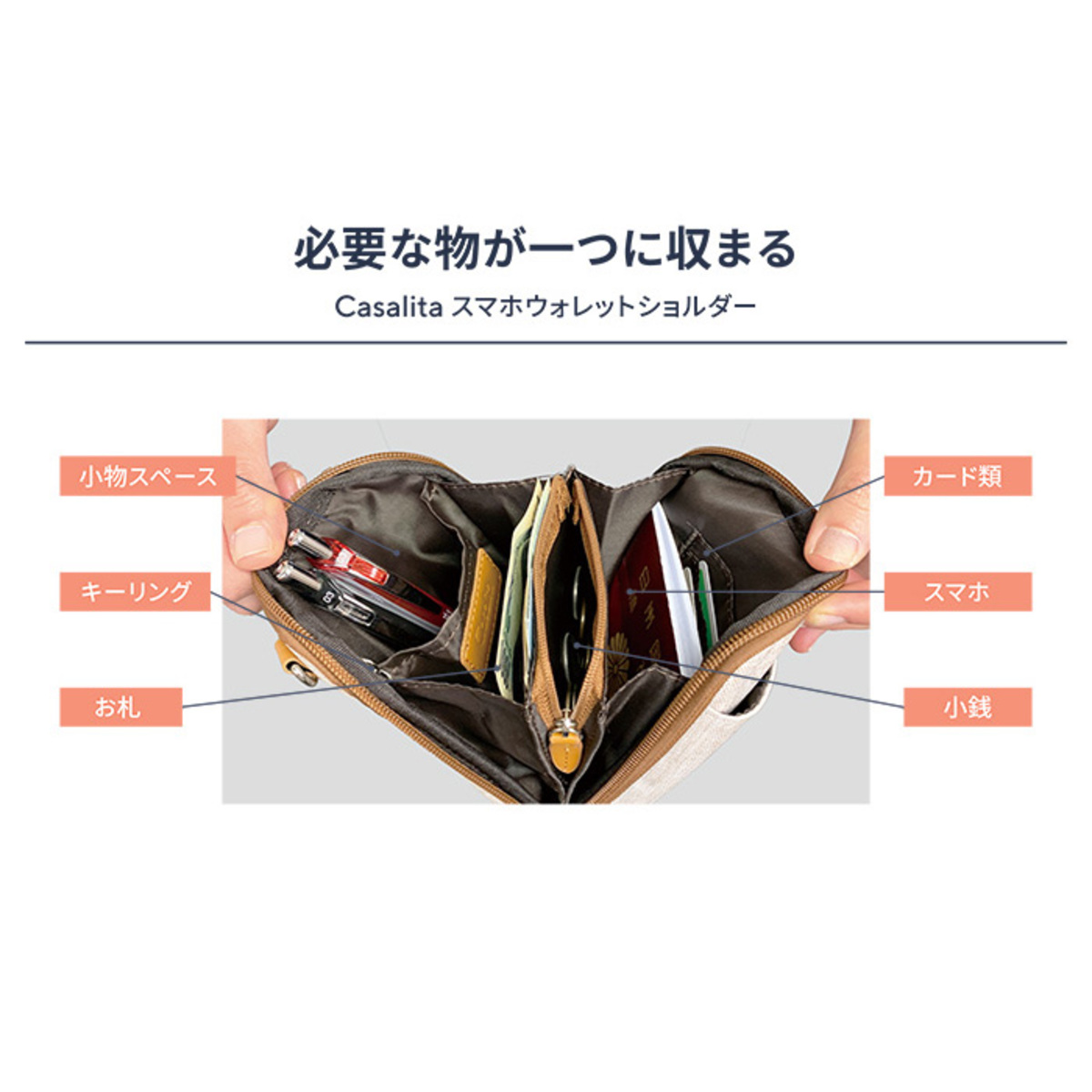 お出かけ時に便利なスマホウォレットショルダーです。深底ポケット、小銭入れ、カードポケットなど、整理しやすい9つの機能的なポケットを備えています。さらにポーチの中には、取り外しできるキーリングも付いています