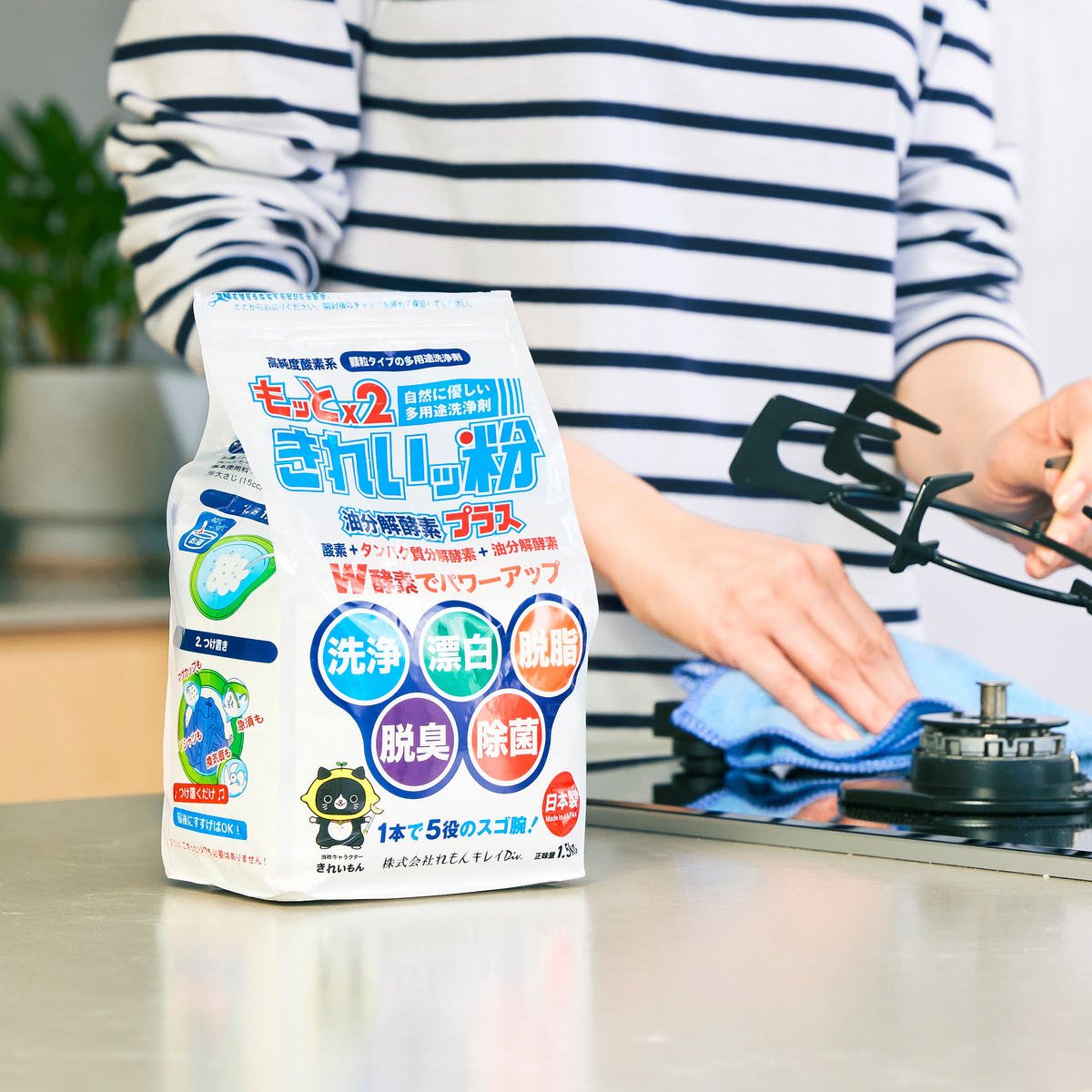 酵素の力で汚れを分解する、1本5役(洗浄 漂白 脱脂 脱臭 除菌)の酸素系漂白剤です。