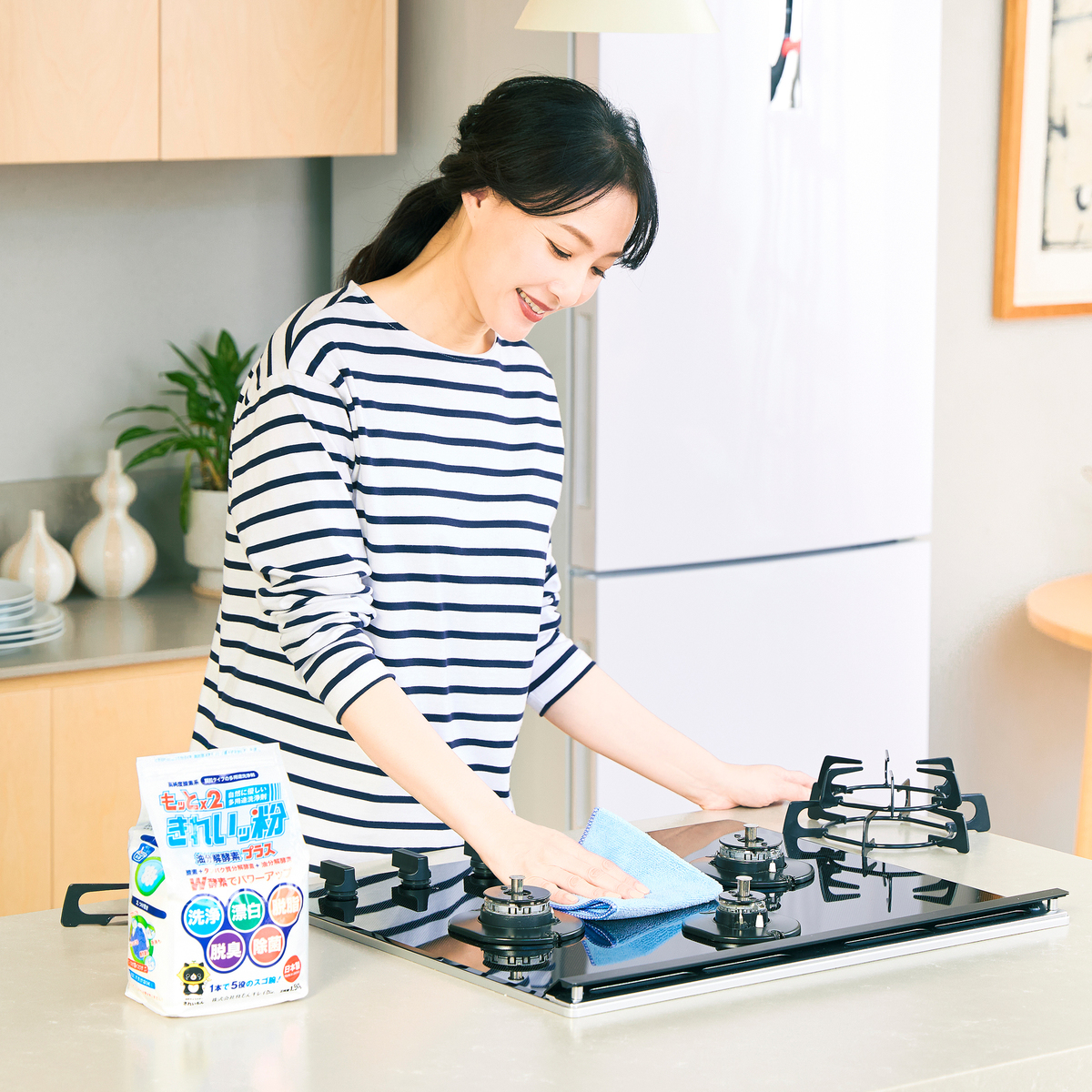 もともとはクリーニング店等に、業務用漂白剤として販売していた「きれいッ粉」。洗濯、掃除、キッチンまわりのアイテムなどに、水に溶かしてつけ置きすると、洗浄とともに漂白*、除菌**効果が期待できます。洗濯機で使用する場合は洗濯用洗剤と一緒に、洗濯機に入れてお使いください