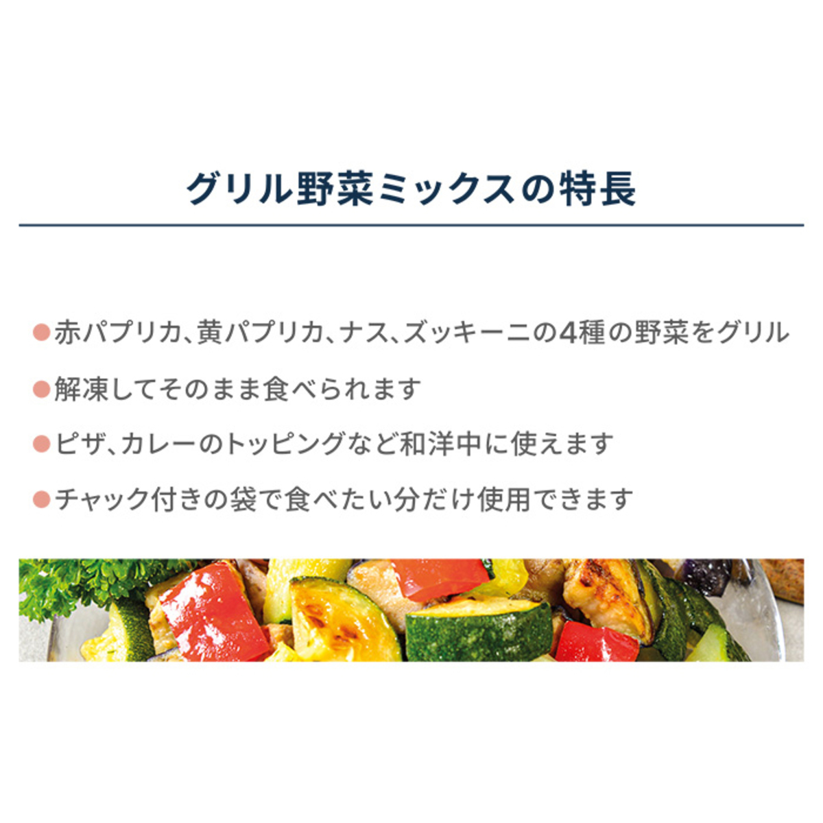 市販のピザに乗せて焼いてベジタブルピザにしたり、いつものカレーにトッピングするだけでグリル野菜カレーに。様々なお料理で便利にご活用いただけます