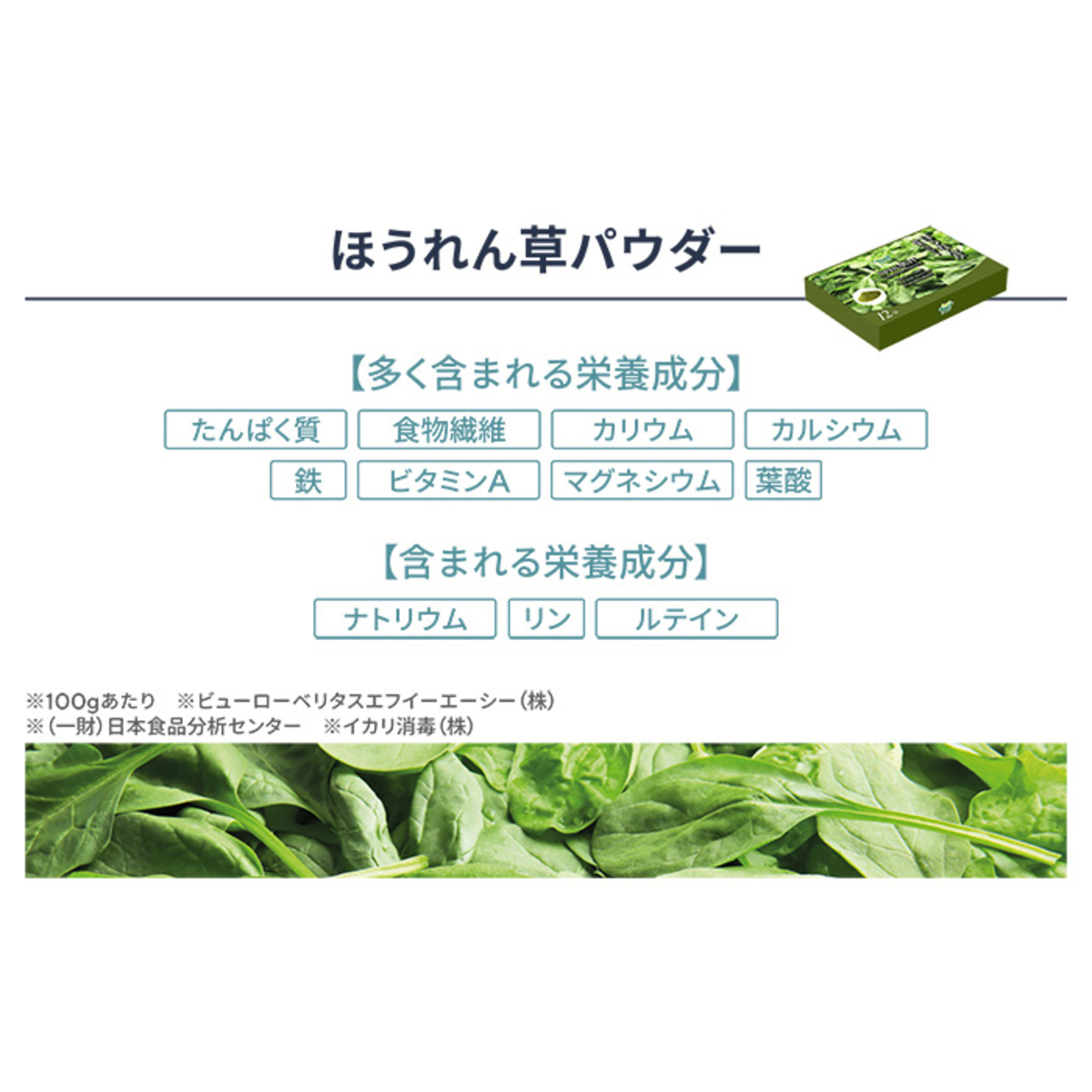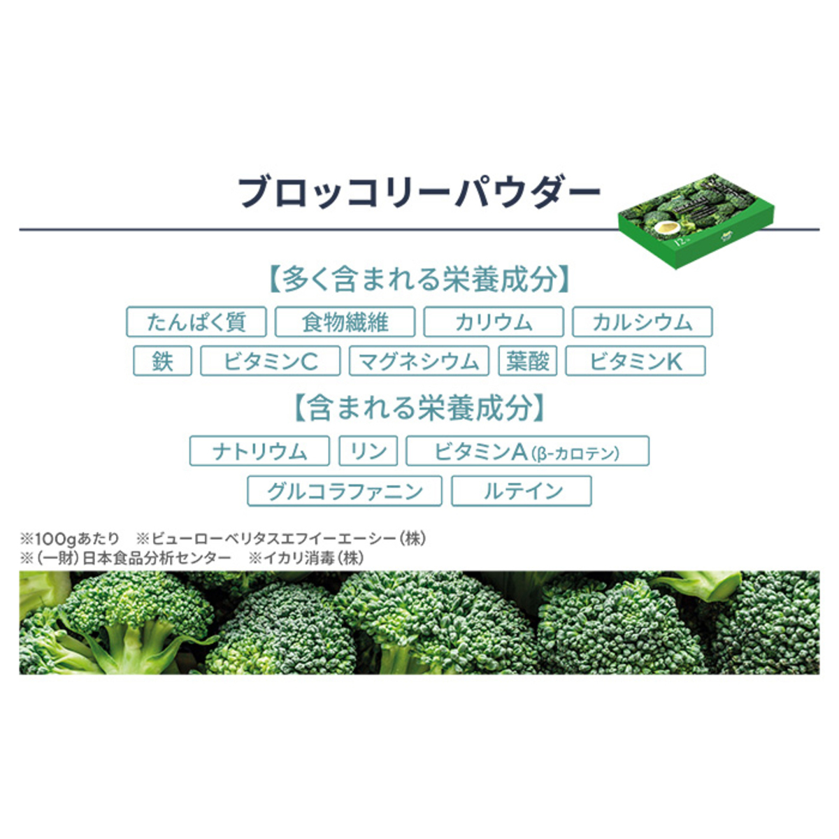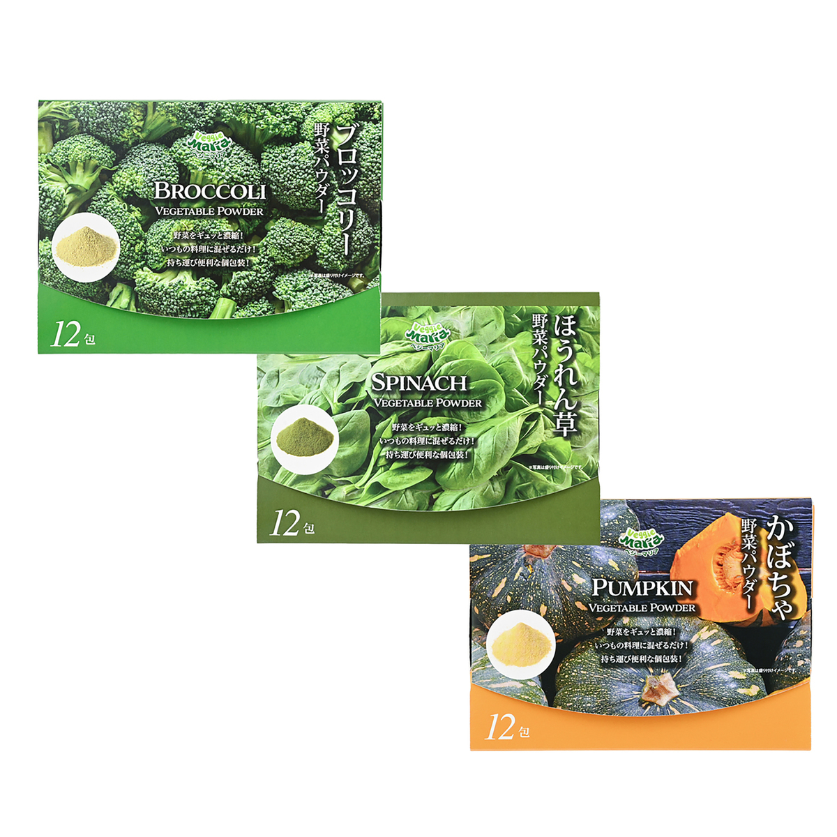 [アレルギー物質特定原材料8品目] なし [商品内容] ・ブロッコリー ・ほうれん草 ・かぼちゃ 各2g×12袋/計36袋 [賞味期限] 出荷時点で賞味期限まで250日以上ある商品をお届けします [保存方法] 開封前:直射日光や高温多湿を避けて保存してください 開封後:お早めにお召し上がりください [お召し上がり方] 飲み物や食事に混ぜてお召し上がりください [注意事項] ※個包装を開封後は、お早めにお召し上がりください ※本製品は自然素材を原料としておりますので、色調などに 多少の違いが生じる場合がありますが、品質には 問題ありませんので、安心してお召し上がりください [原料原産地] ブロッコリー粉末(ブロッコリー(国産)) ほうれん草粉末(ほうれん草(国産)) かぼちゃ粉末(かぼちゃ(国産)) [加工地] 日本 [原材料] 野菜パウダーブロッコリー:ブロッコリー粉末(ブロッコリー(国産))、でん粉 野菜パウダーほうれん草:ほうれん草粉末(ほうれん草(国産))、でん粉 野菜パウダーかぼちゃ:かぼちゃ粉末(かぼちゃ(国産))、でん粉