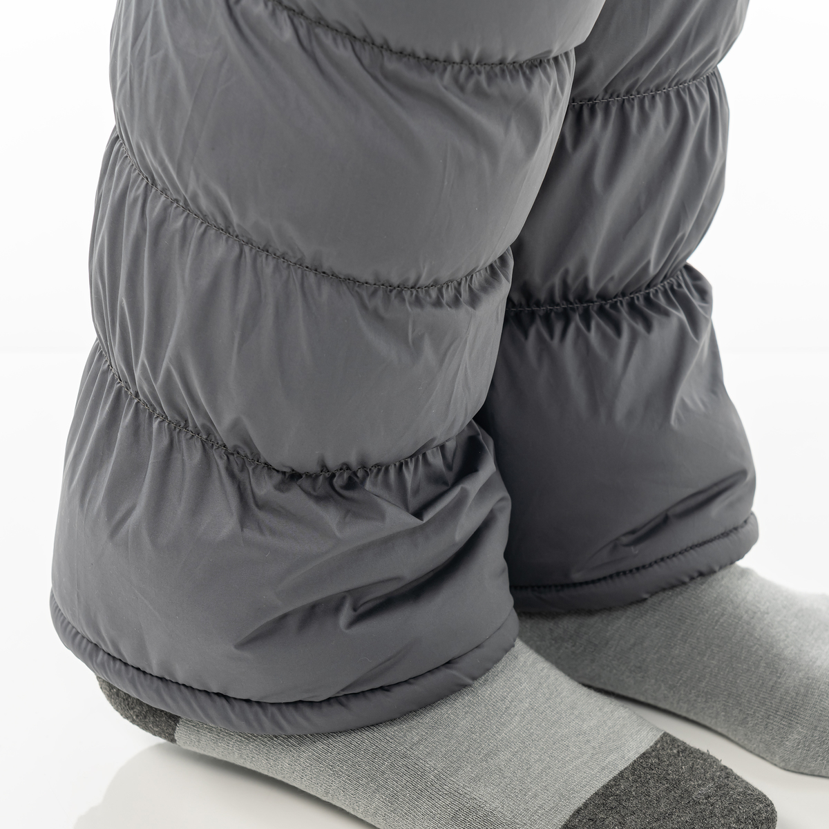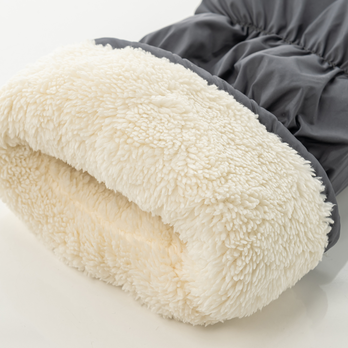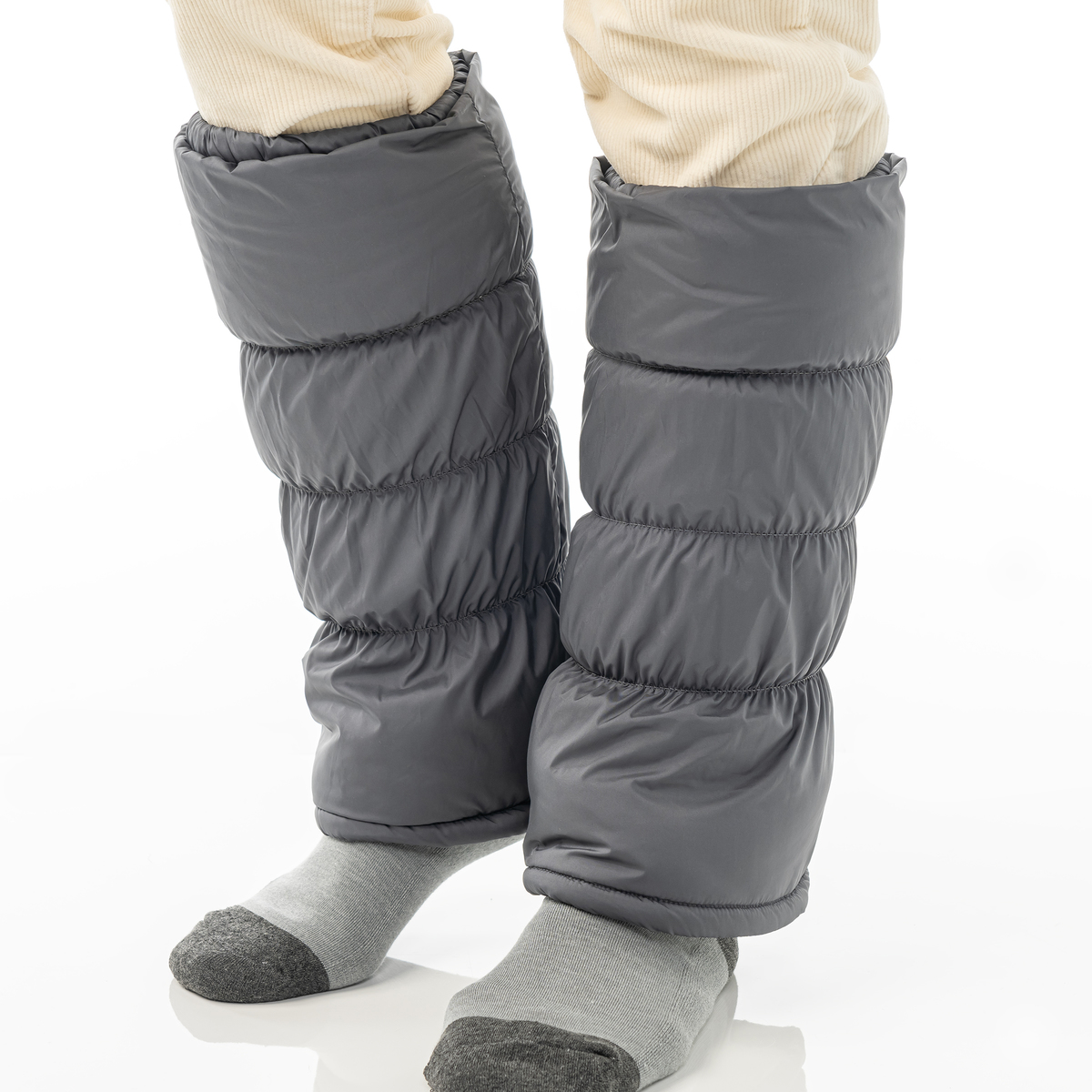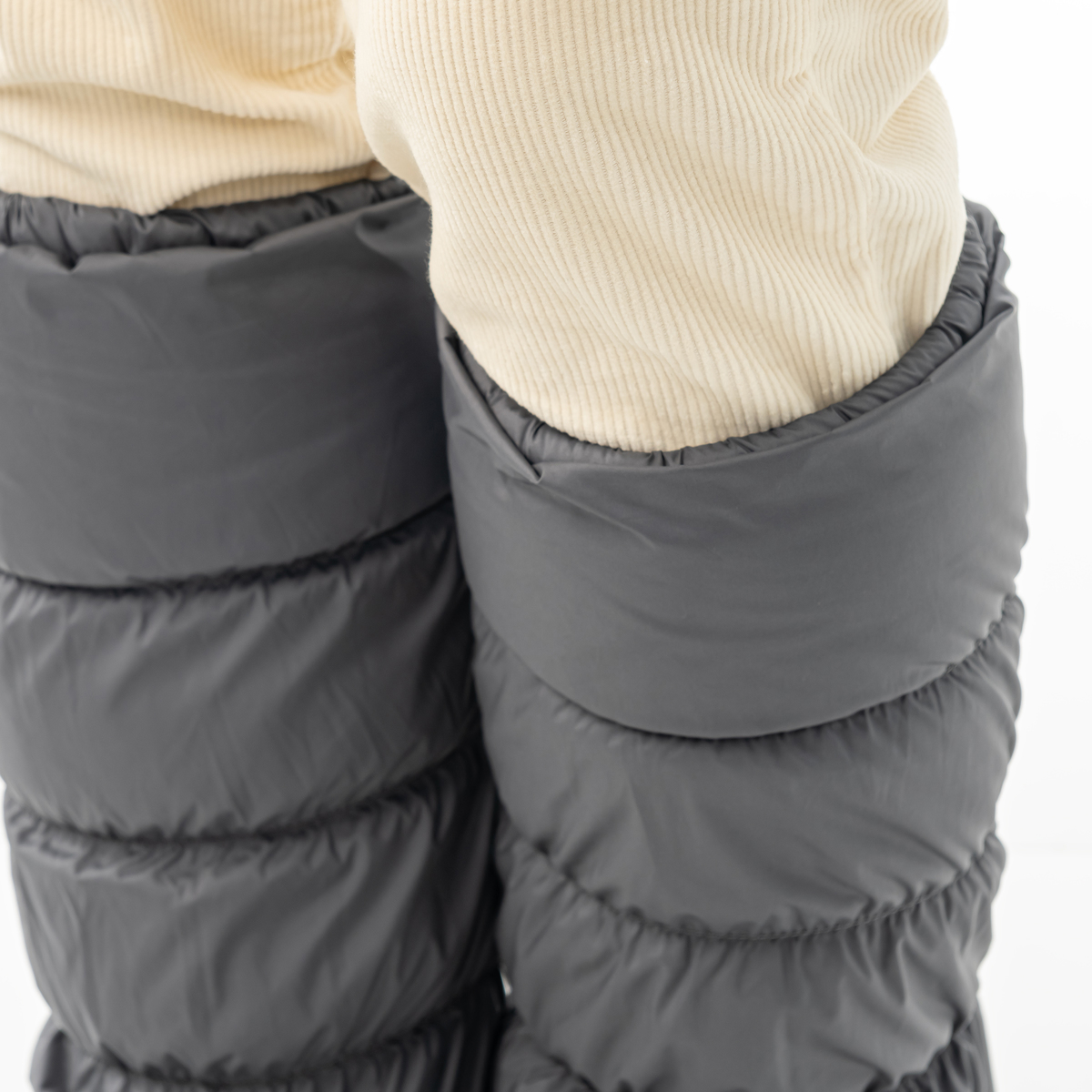 内側の生地には、あたたかなフリースボアを使用しました。長さが38cm設計で、ふくらはぎをすっぽり包み込んであたたか。生地も中わたも軽量なので全体的に軽く、家の中でも外でも気軽にお使いいただけます