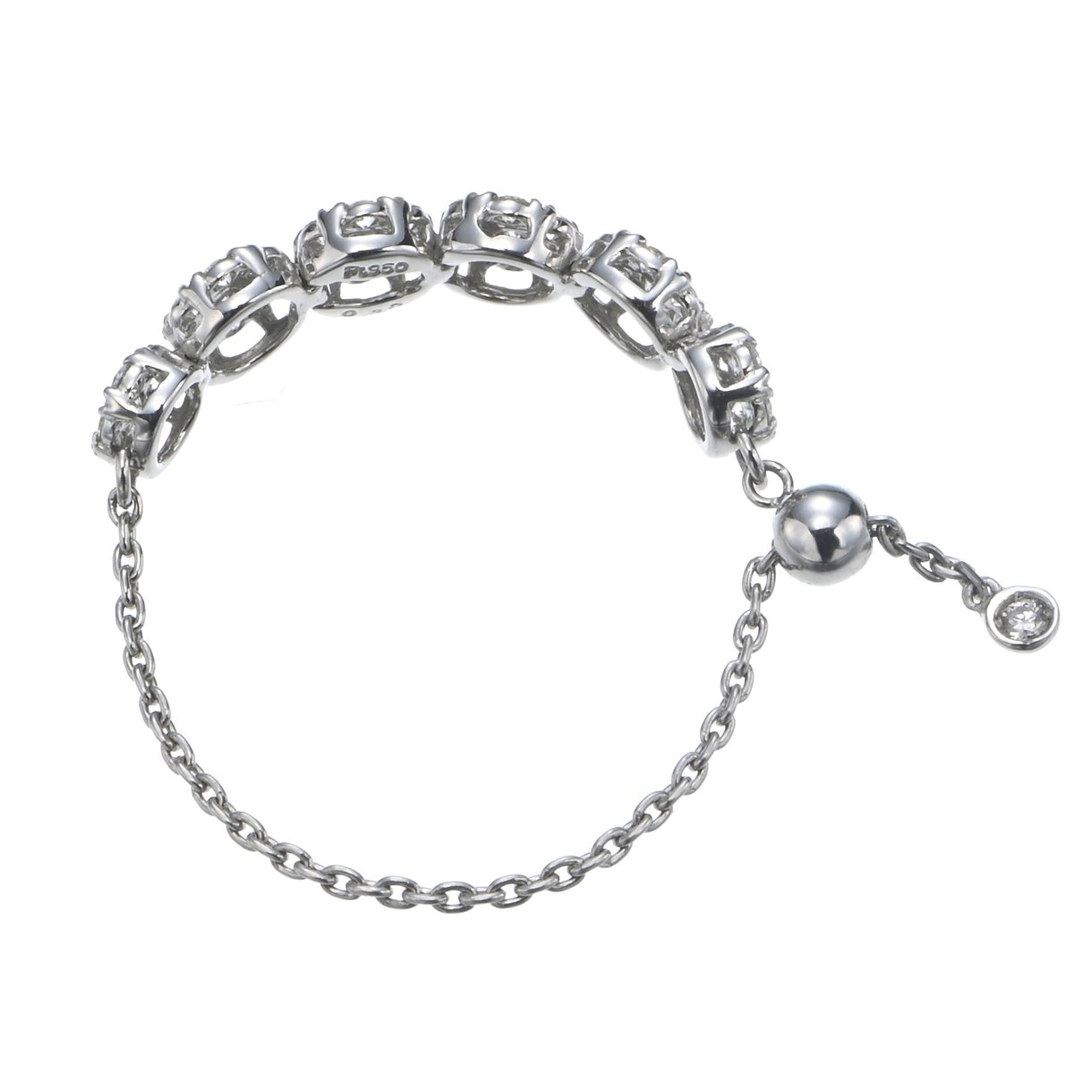7石の集合体パーツを6個繋げてゴージャスにデザイン。43石ものダイヤモンドを贅沢に使ったチェーンリングです。1号から22号まで自在に調節出来るフリーサイズリングで、着ける指はお好み次第。重ね着けなどのコーディネートにも活躍します。フリーサイズなのでプレゼントにもおすすめです