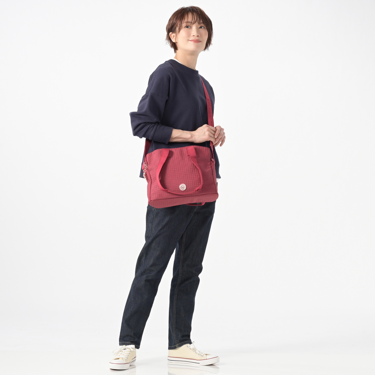 [サイズ(約)] 縦25×横30(最大)×マチ10cm ハンドル立ち上がり:27cm ショルダー立ち上がり:34〜78cm [重量]約400g(付属品含む) [素材] 表地:ナイロン 裏地:ポリエステル [仕様] 付属(取り外し可):チャーム×1 開閉:ファスナー式 底ビョウ:無 裏地:有 [ポケット] <内側> ファスナーポケット×1、オープンポケット×1、ペン挿し×2、キーフック×1 <外側> 前面:マグネットアオリポケット×1 後面:マグネットアオリポケット×1 [注意事項] ※直射日光や蛍光灯の影響で変色する場合がありますのでご了承ください 【インドネシア製】