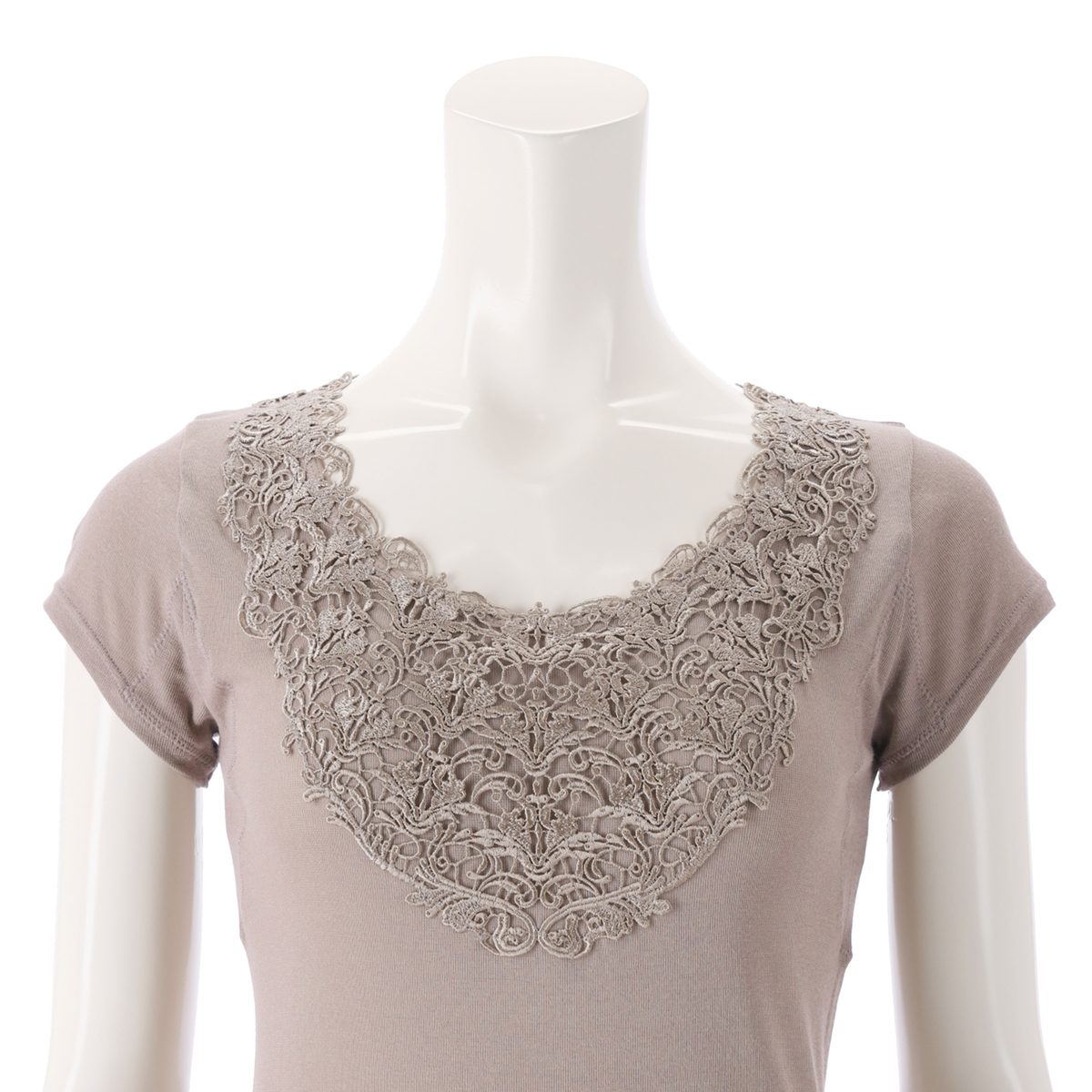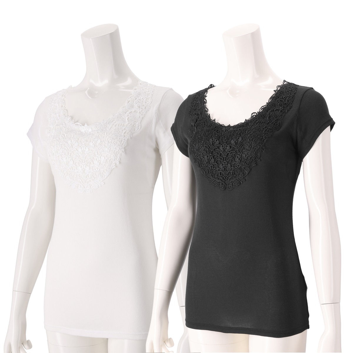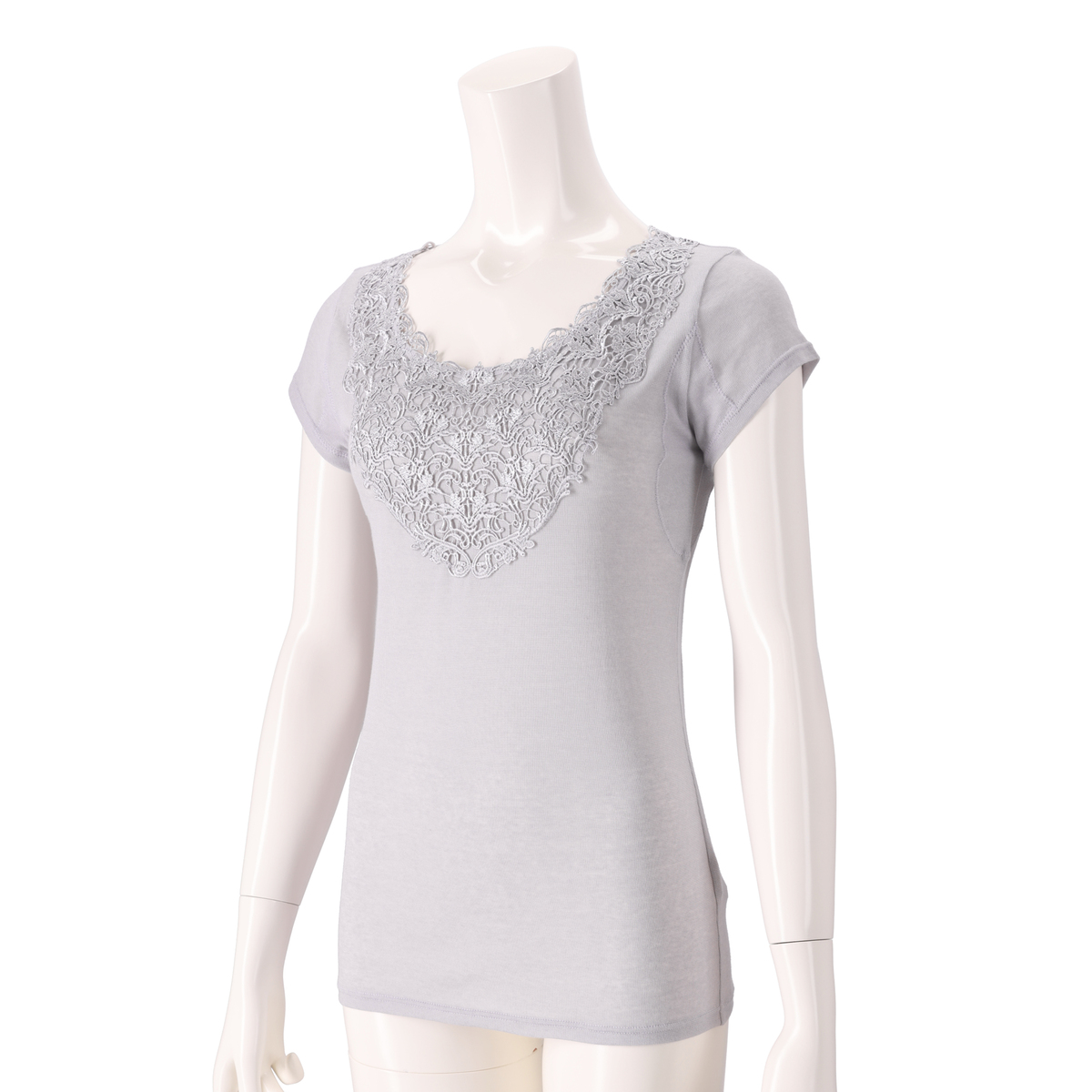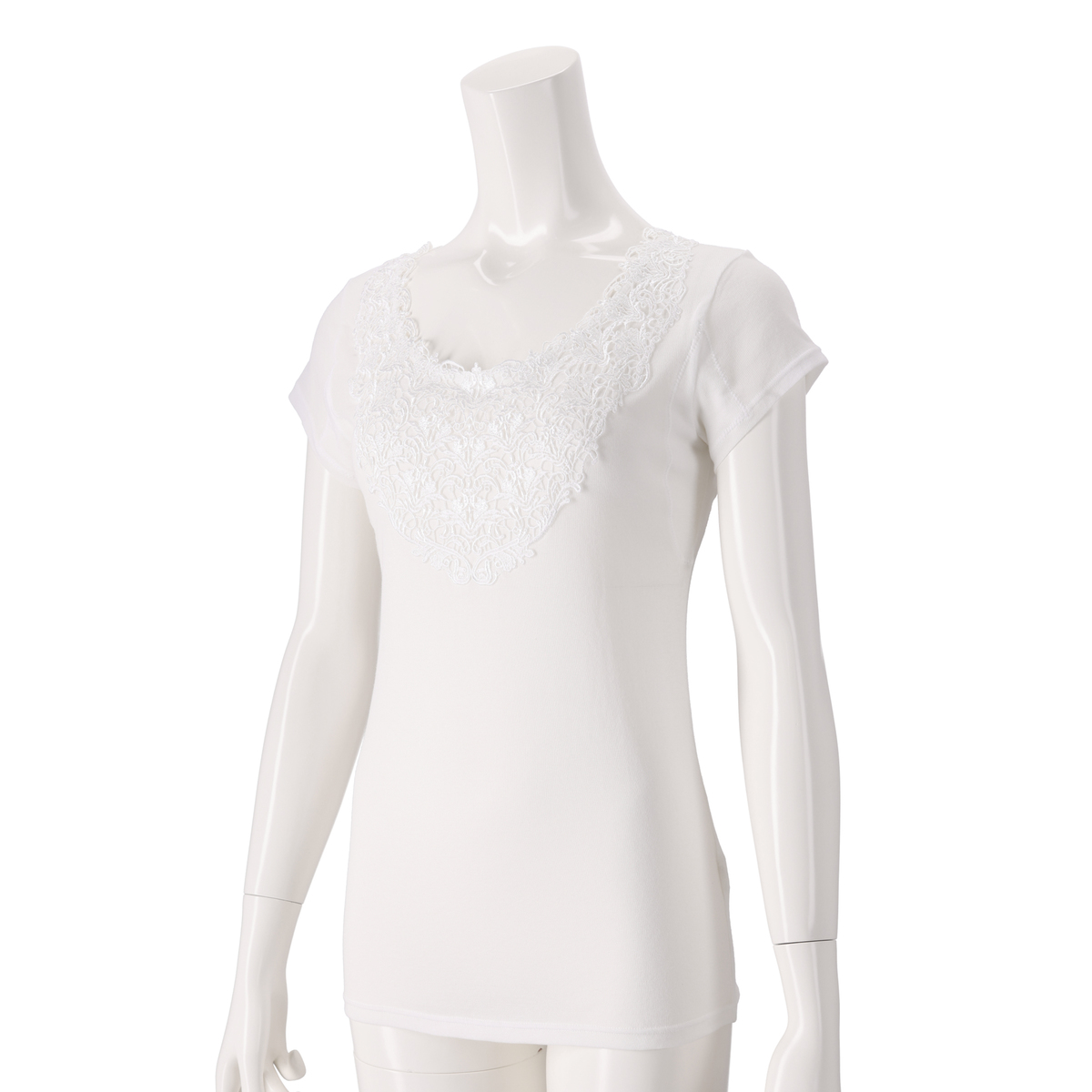 デザイナーが手書きで柄を起こしたオリジナルの刺繍レースが高級感漂う、フレンチ袖のインナーです。後ろからレースを縫いつけているため、まるでレースが浮いているかのように見えるデザイン。チュニックやワンピース、羽織りもののインに着用すれば、胸元をエレガンスに演出します