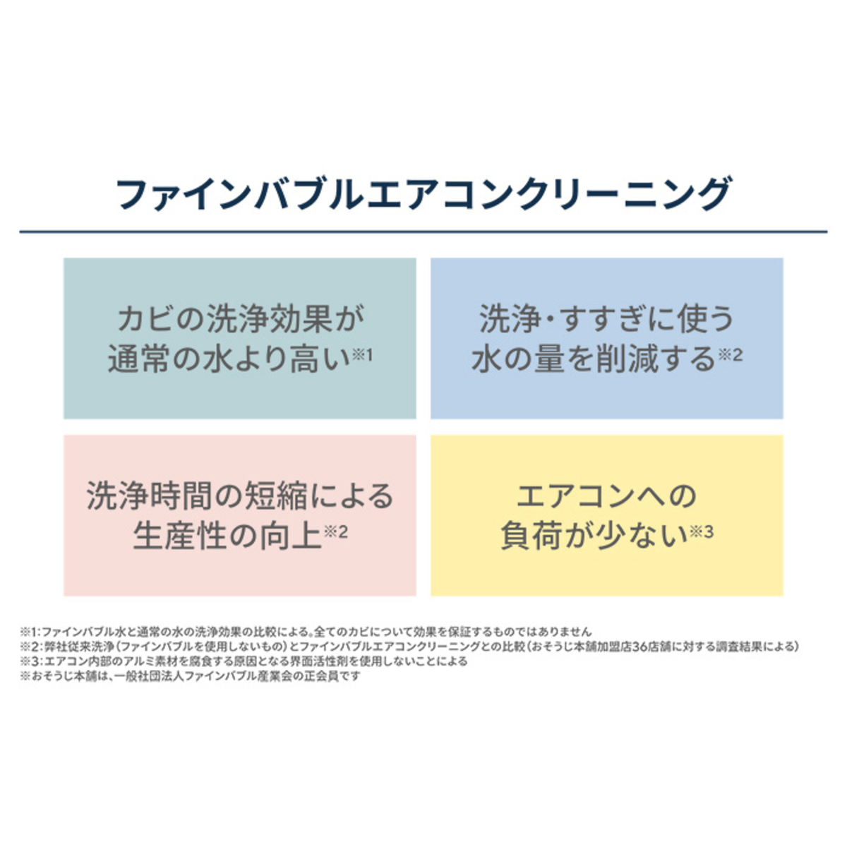 おそうじ本舗がエアコンをクリーニング。所要時間は約3〜4時間。エアコン本体、お掃除ユニット、アルミフィン、送風ファン、外装パネル、フィルターを清掃し、防カビチタンコーティングを行います