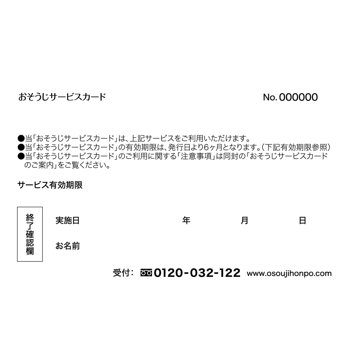 [商品内容] ハウスクリーニングカード [所要時間] 約3〜4時間 [清掃範囲] エアコン本体、お掃除ユニット、アルミフィン、送風ファン、外装パネル、フィルター、防カビチタンコーティング [有効期限] 発行日より6カ月 [注意事項] ※おそうじサービスの実施日は、出来る限り調整いたしますが、ご用命が重なりお客様のご希望に沿えない場合もございます。何卒ご了承ください。繁忙期の7〜8・12月中の実施におきましては、お早めのご依頼をお願いいたします) ※当おそうじサービスカードは、一部の地域で対応できない場合がございます。お客様のご住所が対応可能地域かどうか、下記のお問い合わせ先にて必ずご確認ください ※サービス実施日は、電気・ガス・水道・洗浄スペースを無償でお借りします ※サービスには万全を期しておりますが、万が一事故が起きた場合には、弊社が責任を持って保険の範囲内で責任補償させていただきます ※対象サービス以外のおそうじサービスをご希望の方は、訪問時にお申し付けください。別途お見積りさせていただきます。その際、実施した場合には別途サービス費用をご負担いただきます ※当おそうじサービスカードの有効期限は発行日より6ヶ月となっております。有効期限を過ぎた場合、おそうじサービスはご利用いただけません ※当おそうじサービスカードを紛失された場合、おそうじサービスはご利用いただけません。再発行も行っておりませんので、くれぐれもご注意ください ※当おそうじサービスカードのご利用による差額の返金はいたしかねます ※おそうじ本舗にお問い合わせ・お申込みされたお客様の個人情報は、HITOWA ホールディングス株式会社、HITOWA ライフパートナー株式会社と FC 加盟店の範囲内で弊社ホームページの定めに従い、利用いたします。https://www.osoujihonpo.com/policy/ ※作業店舗の指定はできかねます。あらかじめご了承ください ※年式・機種・設置状況などによって対応できない場合がございます ※汚れの状況により、完全に除去できない場合がございます