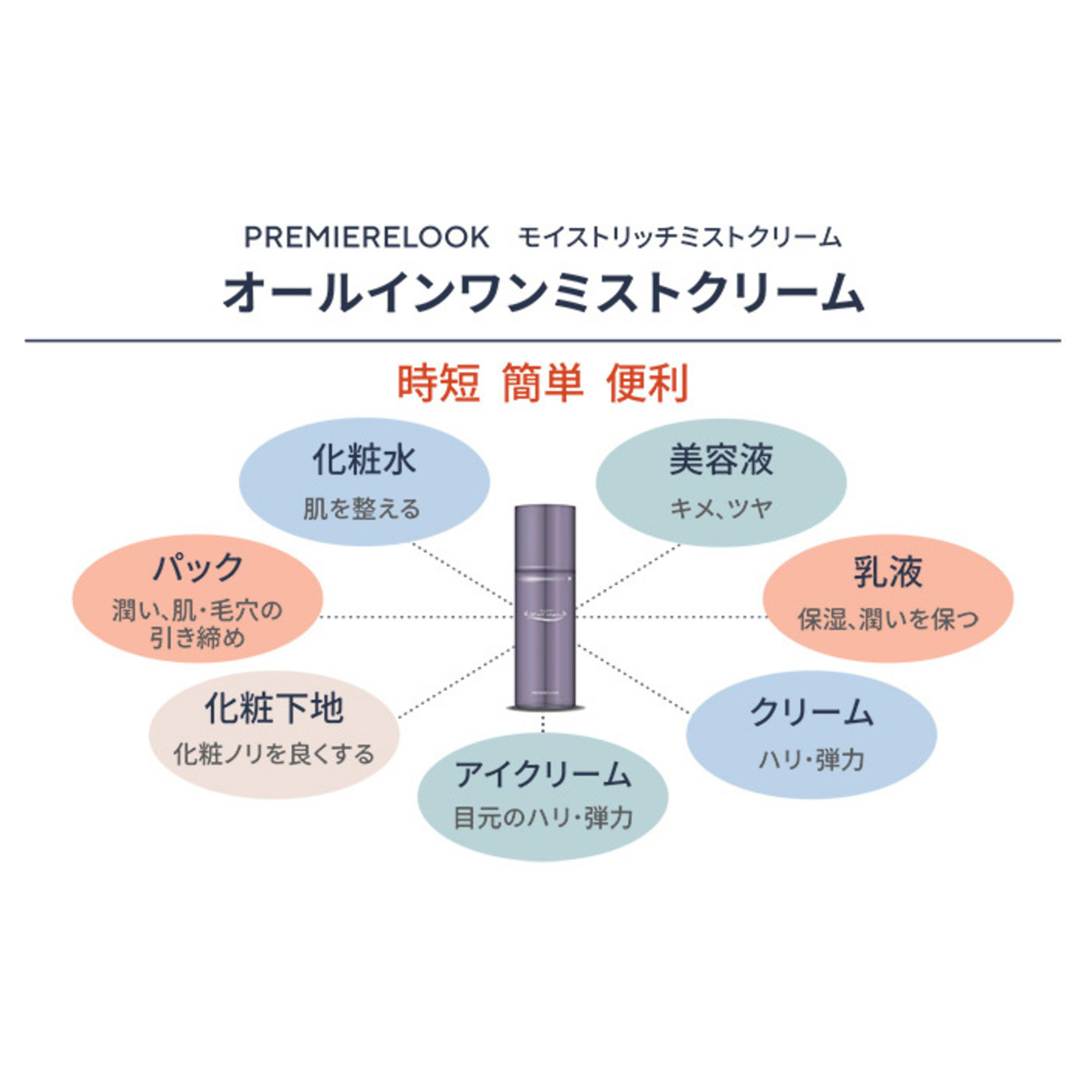 濃厚なテクスチャーのクリームを微粒子のミスト状にしたPREMIERELOOKモイストリッチミストクリーム。米国Microflidics社のモデルM110PのMICROFLUIDIZERを利用して微粒子のミスト状にすることで、肌への浸透力(*1)を高めることを目指し、軽いテクスチャーでありながら大人の肌に必要な高保湿ケアを可能にした画期的なスキンケアアイテムです