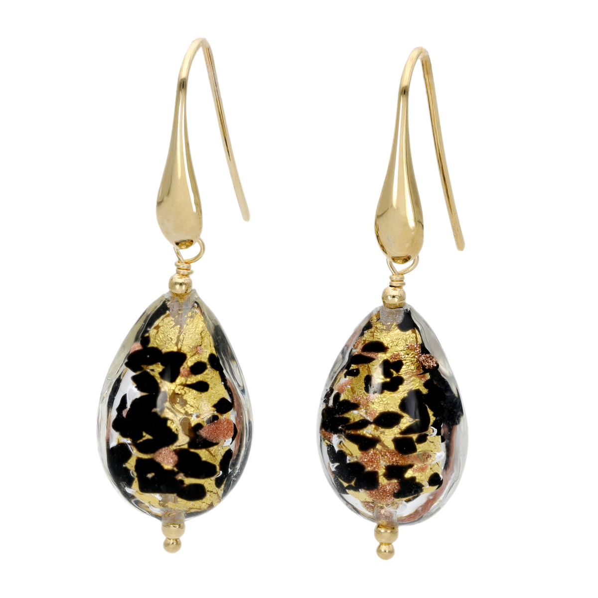 800年以上の長い歴史を持つムラーノガラスとモダンなデザインが融合。ブラックとイエローゴールド箔のサファリ風模様がファッションのアクセントになる、イヤリングまたはピアスです。耳元を美しく見せるティアドロップ形に手作業で形成しました