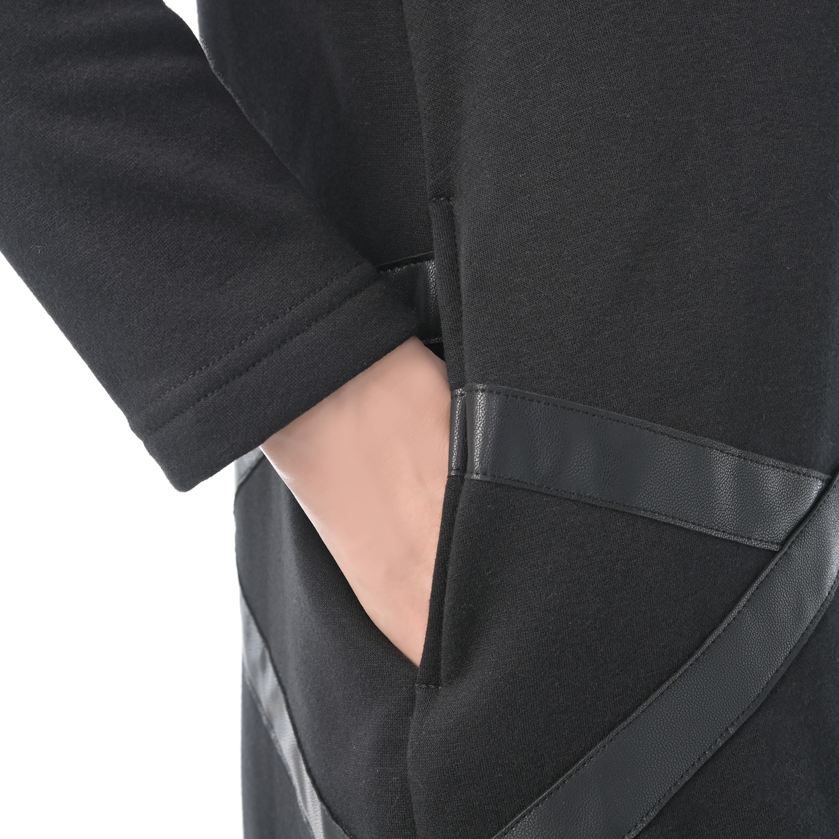 [商品寸法(ヌード寸法)cm] サイズ バスト 着丈 M: 98(79〜87) 90 L: 104(85〜93) 91 LL: 110(91〜99) 92 サイズ 肩幅 袖丈 ウエスト ヒップ M: 36 56.5 (66〜72) (85〜91) L: 37 56.5 (70〜76) (89〜95) LL: 38 57.5 (74〜80) (93〜99) [素材] 本体:ポリエステル60% 綿35% ポリウレタン5% 別布:合成皮革 [お手入れ] 洗濯機洗い可 [注意事項] ※商品寸法の誤差は多少発生します。ご了承下さい ※淡色製品には蛍光増白剤入り洗剤を使用しないで下さい ※洗濯後は重ね置きしないで下さい ※洗濯後はすぐに脱水し、形を整えて干して下さい。長時間、水につけたままにしないで下さい ※素材の特性上、着用や洗濯・クリーニング時の摩擦により毛羽立ち、毛玉が発生します。その際はお早めに毛玉取り器等で手入れをして下さい ※直射日光や蛍光灯の影響で変色することがありますのでご了承下さい ※濃色製品は着用中の摩擦により色移りすることがあります。また、雨や汗等で濡れた状態で着用すると色移りすることがあります。その際はお早めに洗濯をして下さい ※洗濯やクリーニングにより徐々に色あせします。また、色落ちすることがありますので、他の物と分けて洗って下さい ※洗濯の際は裏返しにし、洗濯ネットを使用して下さい ※雨や水に濡れた時は、ただちに乾いたタオル等で押さえ取り、こすらずふき取るようにして下さい ※合成皮革は時間の経過と共に劣化が起こる可能性があります ※高温高湿を避け、直射日光の当たらない風通しのよい場所で保管して下さい 【中国製】