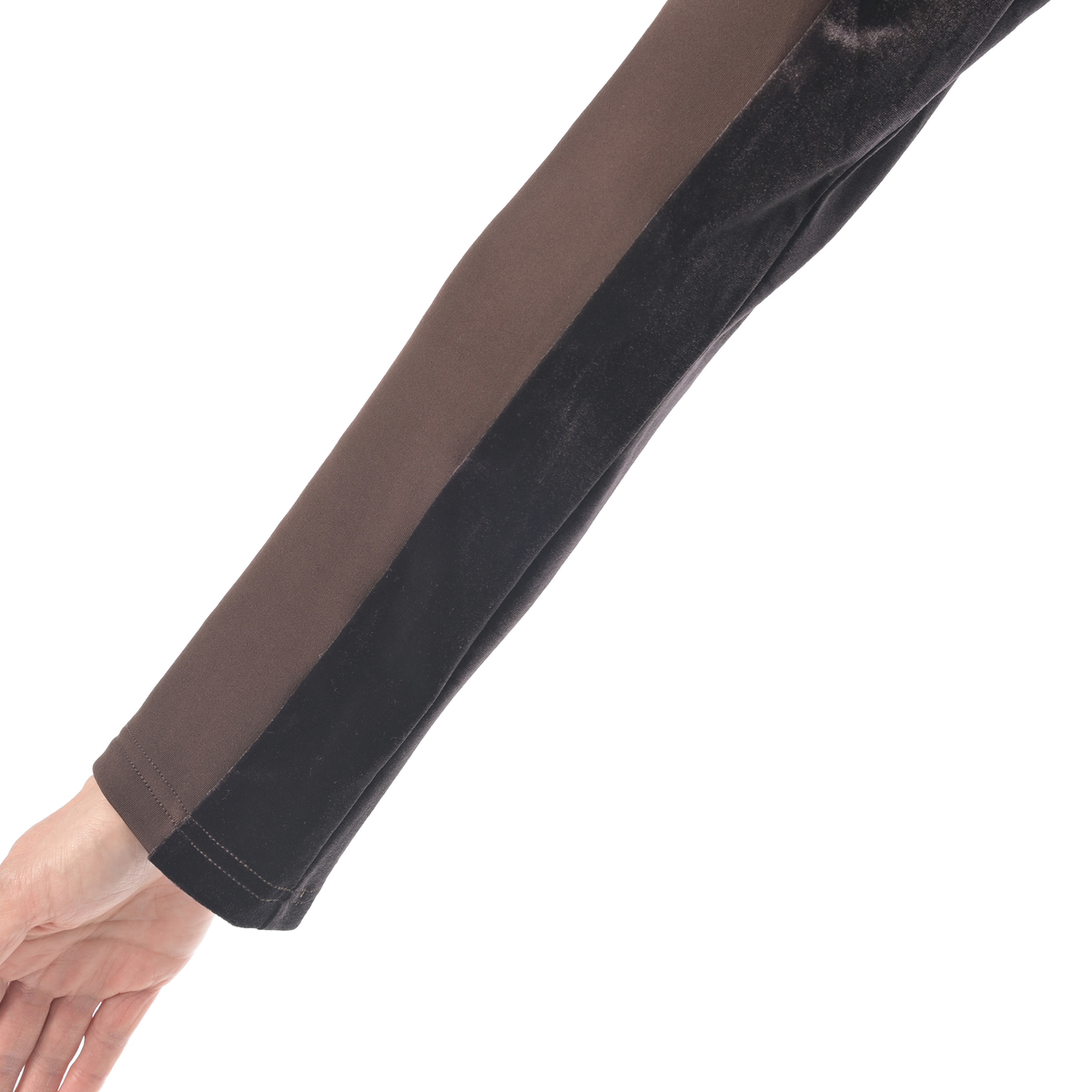 裏起毛素材とベロアの切り替えが印象的なプルオーバーです。胸、脇、袖の内側をベロアで切り替え、スタイリッシュにデザインしています