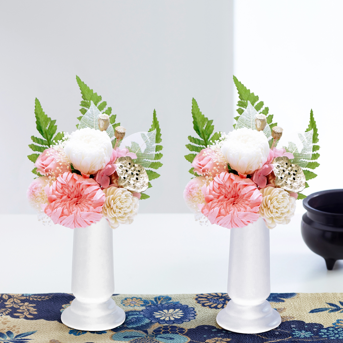 ピンクと白を基調にした色合いでアレンジした、仏花用のプリザーブドフラワーです。菊、バラ、アジサイ、カスミソウ、スケルトンリーフのプリザーブド素材に、造花やドライフラワーも合わせました