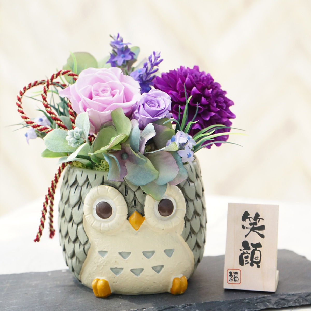 水やり不要のフラワーアレンジです。縁起の良い鳥とされるふくろうをモチーフとした器に、寒色系のプリザーブドフラワーなどをアレンジしました