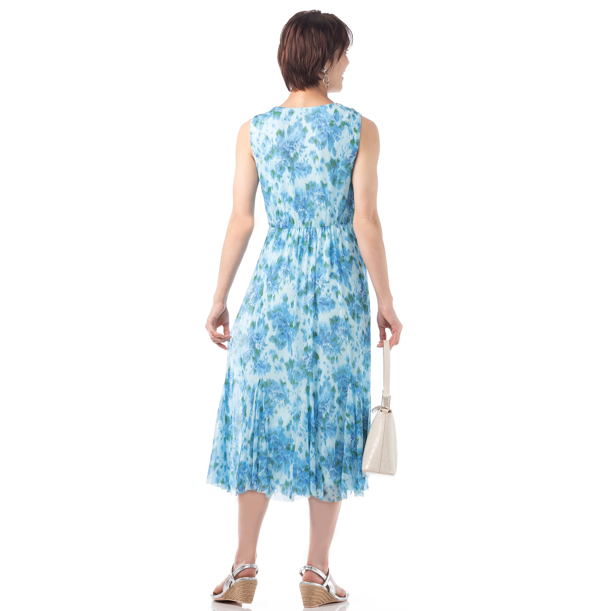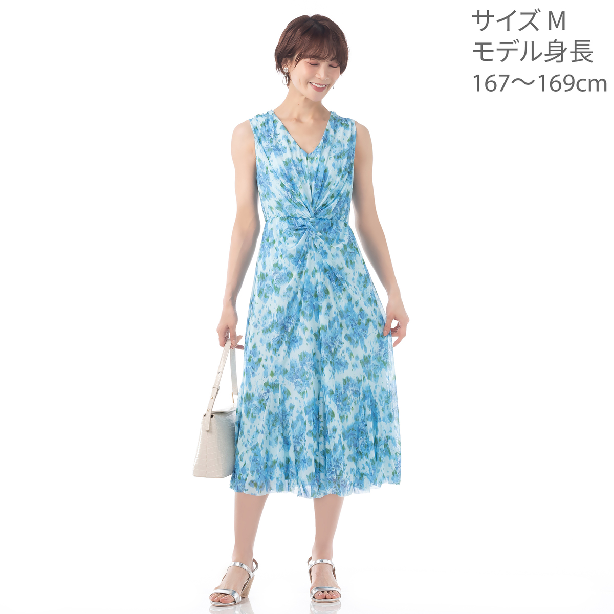 メッシュ素材のノースリーブワンピースです。セミフィットのエレガントな大人シルエットが、素敵なお出かけスタイルを演出。裏地付きで、ウエストはゴム入り。カラーに合った異なる柄も楽しく、汚れたら洗濯機洗いできる手軽さも魅力です