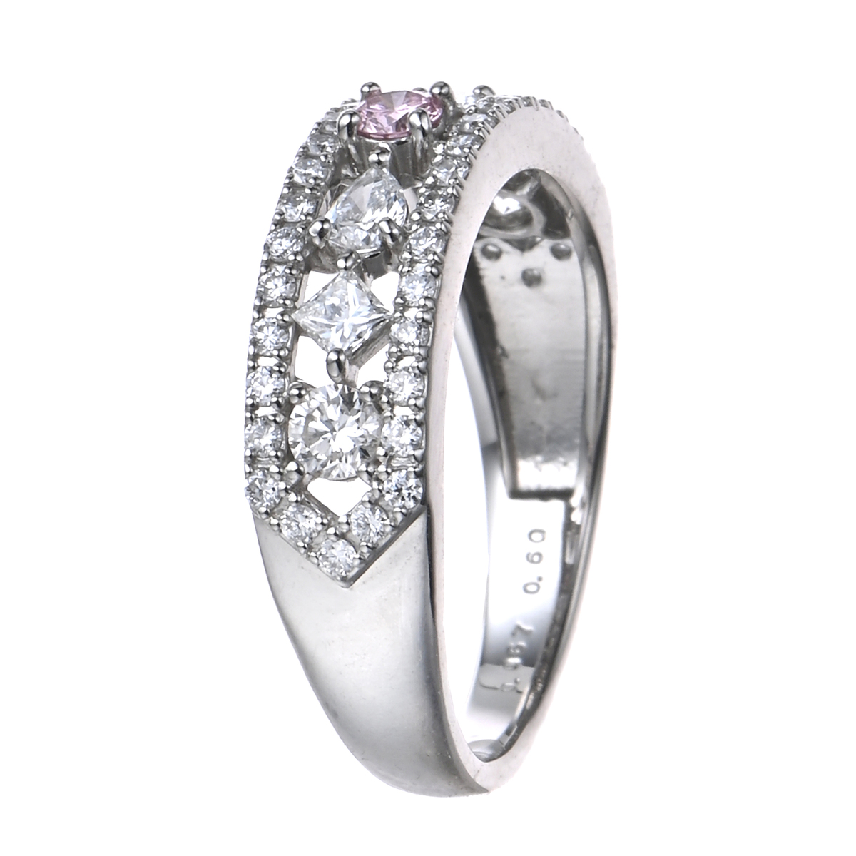 素材:[ピンクダイヤモンド] ラウンドシェイプ 爪留め 1石 0.06ctUP (カラー:ファンシーインテンスパープリッシ ュピンク) [ダイヤモンド] ペアシェイプ 2石、プリンセスカット 2石、 ラウンドシェイプ 44石 全て爪留め、 48石合計0.60ctUP 最大幅(約) 5.5mm 最小幅(約) 2.0mm 総重量(約) 4.0g [地金] プラチナ950 [付属品] 鑑定書 ■受注発注商品のためデザイン・価値に影響のない範囲で仕様が変わる場合がございます ■素材の大きさ・形・色合い、製品のサイズは1点1点多少異なります 【日本製】