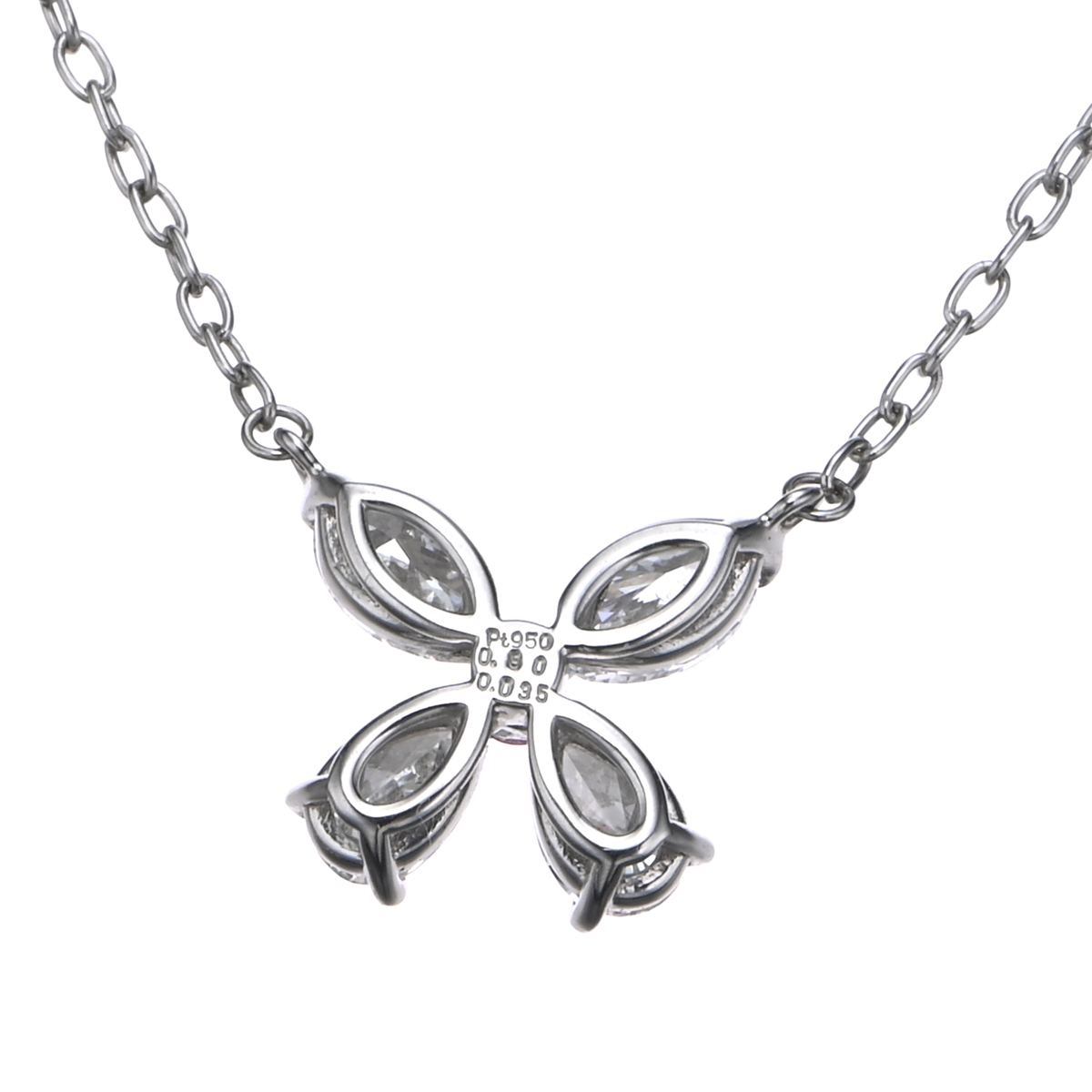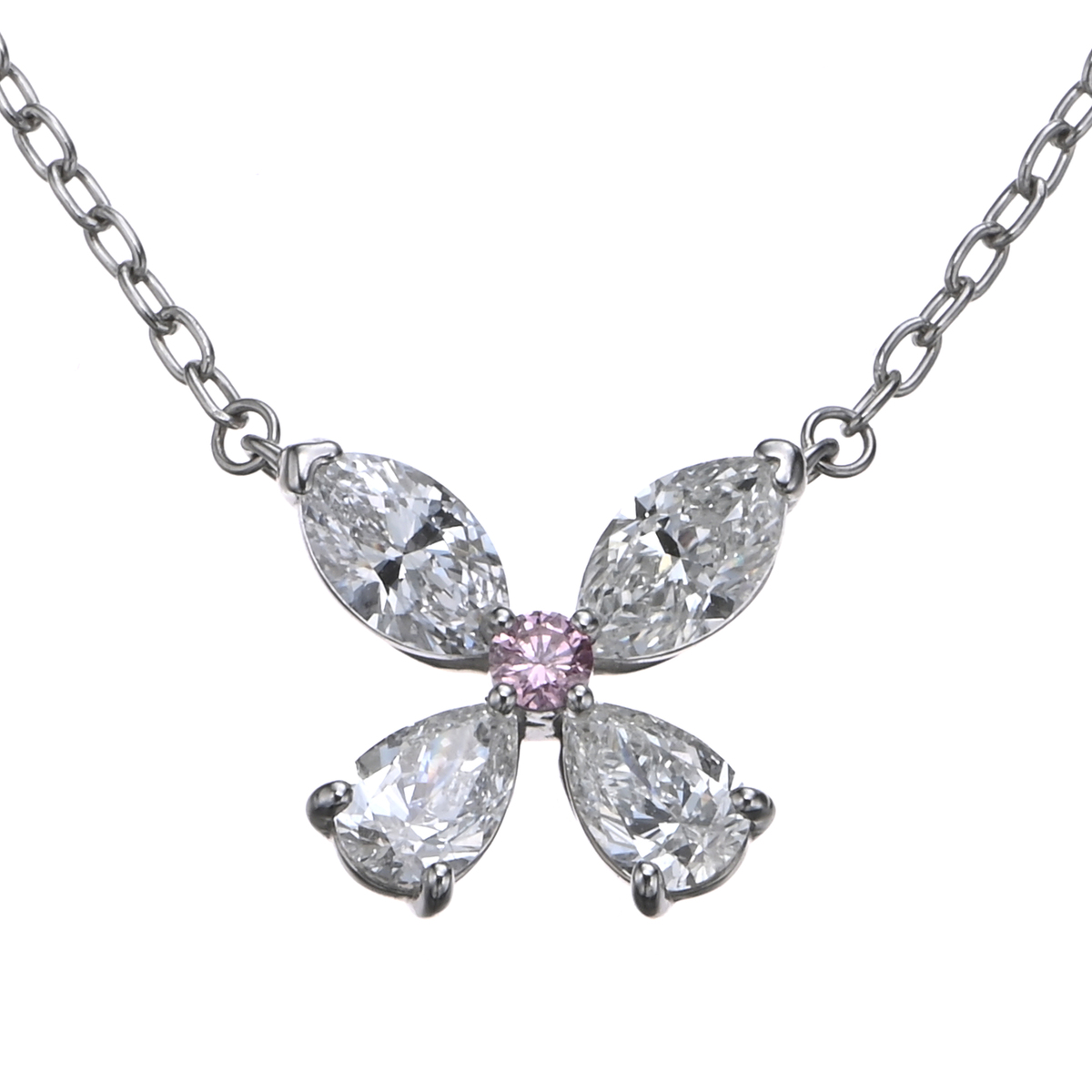 マーキスカットとペアシェイプダイヤモンドの羽を持つ、バタフライネックレス。センターにはファンシーインテンスパープリッシュピンクダイヤモンドをセットしました