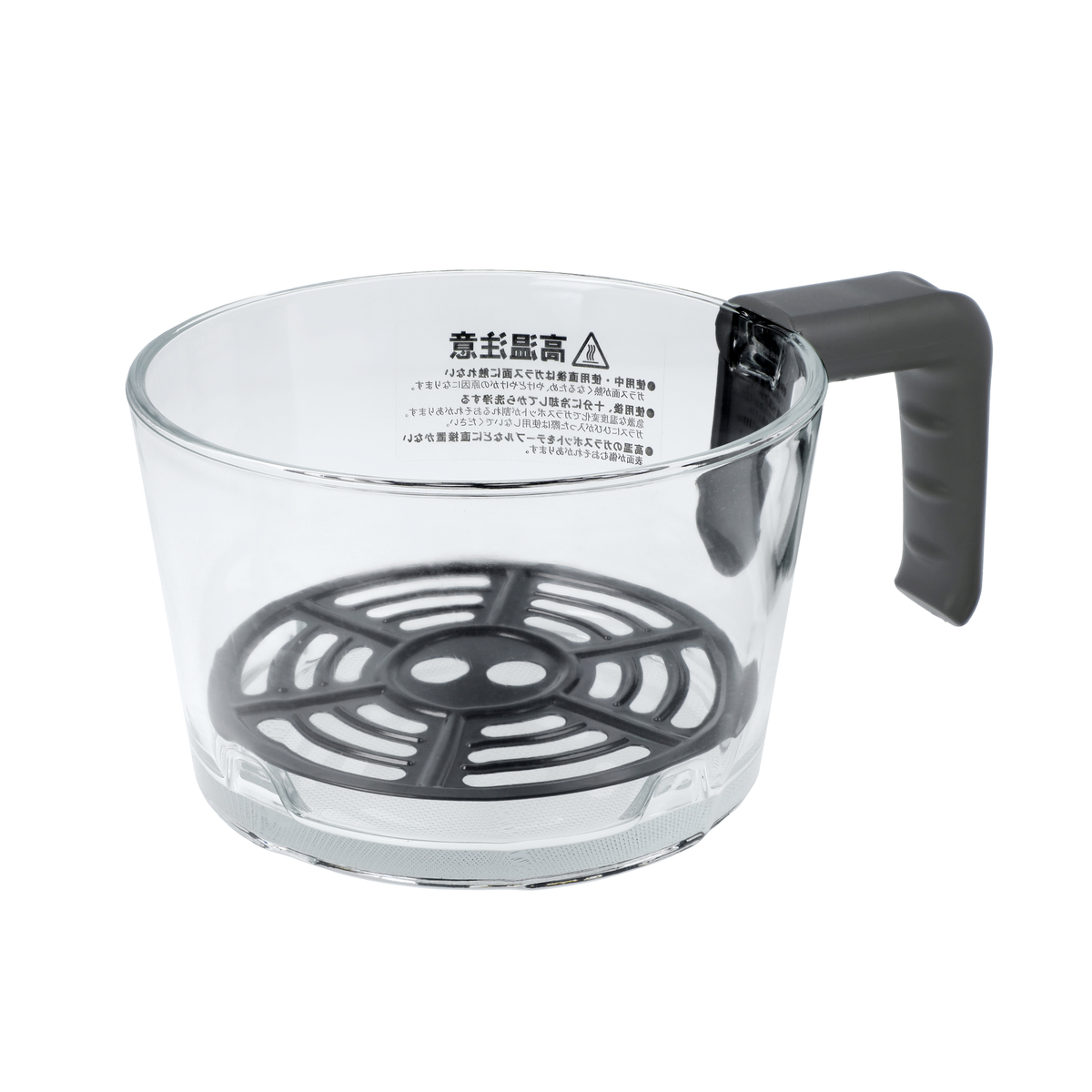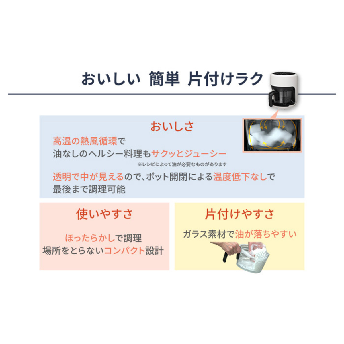 透明のガラスポットなので外から食材の状態がわかり、ポット開閉による温度低下が起こらずに最後まで調理ができます。ポットはガラス素材なので油汚れも落としやすく、後片付けもラクに。タッチパネルで操作も簡単。天面はフラットなのでお手入れもしやすくなっています